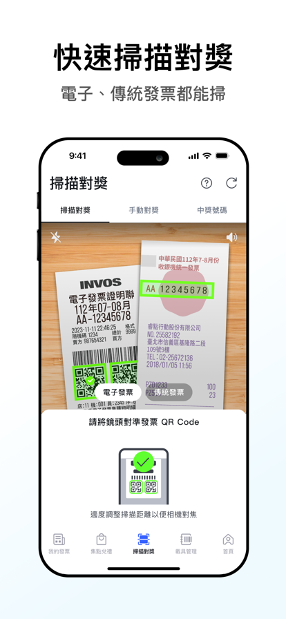 開出最多中獎發票!發票存這裡,中獎機會多一次 賀!發票存摺連續開出最多中獎發票!發票存這裡,中獎機會多一次!快與 800 萬用戶一起使用發票存摺,單月 25 日與財政部準時開獎,中獎不再慢半拍! ※高精度鏡頭掃描技術※ 發票載入快、掃描對獎也超快,電子QRcode發票、傳統長條發票都可對獎,一張接一張,800萬人都在用,中獎不再慢半拍! ※最多元發票對獎活動※ 「發票回饋」種類最多!存 7-11、全家、全聯、好市多...指定商品發票,發票沒中也能賺回饋,搶先換到 LINE POINTS 及超商購物金! ※全方位發票載具管理服務※ 結帳出示手機載具條碼,輕鬆管理所有消費內容!還能設定領獎帳戶接收獎金,讓結帳、對獎、領獎都領先他人一步! ※以人為本的設計界面※ 為使用者體驗持續優化的APP,沒有煩人的彈出或蓋版廣告,就連小朋友都能輕鬆上手,就是要你用的順手! ※超完整消費分析※ 店家、商品名稱皆可查,再買一次比價好方便!獨家合作麻布記帳APP,無痛轉移發票資料,自動產生詳細消費分析! ※ iPhone專屬聰明小工具※ 手機條碼一鍵設在 widget 和 Apple Watch 首頁,支援 Siri 語音指令,結帳掃描快速完成! ◤ 發票存摺小提醒 ◢ ● 發票中獎後欲兌獎仍要保留紙本發票作為憑證唷! ● 統一發票中獎號碼資料來源為財政部電子發票整合服務平台,http://www.einvoice.nat.gov.tw。若有任何出入以財政部資料為準。 ● 電子發票QR code掃描小訣竅 建議您將電子發票的兩個QR code都放進掃描視窗中央的框框裡面,另外掃描的成功率會與手機相機以及發票紙本的品質有關,盡量保持紙本的平整和相機鏡頭的乾淨,也要注意相機的對焦狀態,太暗的話再搭配我們的手電筒功能就萬無一失啦! ● 免責聲明 本程式為免費軟體,對於本軟體所載資料的準確性、可用性、完整性或效用,概不作明確或暗示的保證及聲明,對於使用本程式而可能直接或間接導致的任何損失、損壞或傷害,本軟體之開發者不負任何法律承擔和責任。 ◤ 有任何使用問題歡迎聯繫 ◢ ● 客服信箱:support@invos.com.tw ● 粉絲專頁:https://www.facebook.com/invoicemachine/ 發票存摺小金靈隨時為你服務 如果覺得發票存摺 App 很棒 ,歡迎分享給親朋好友!