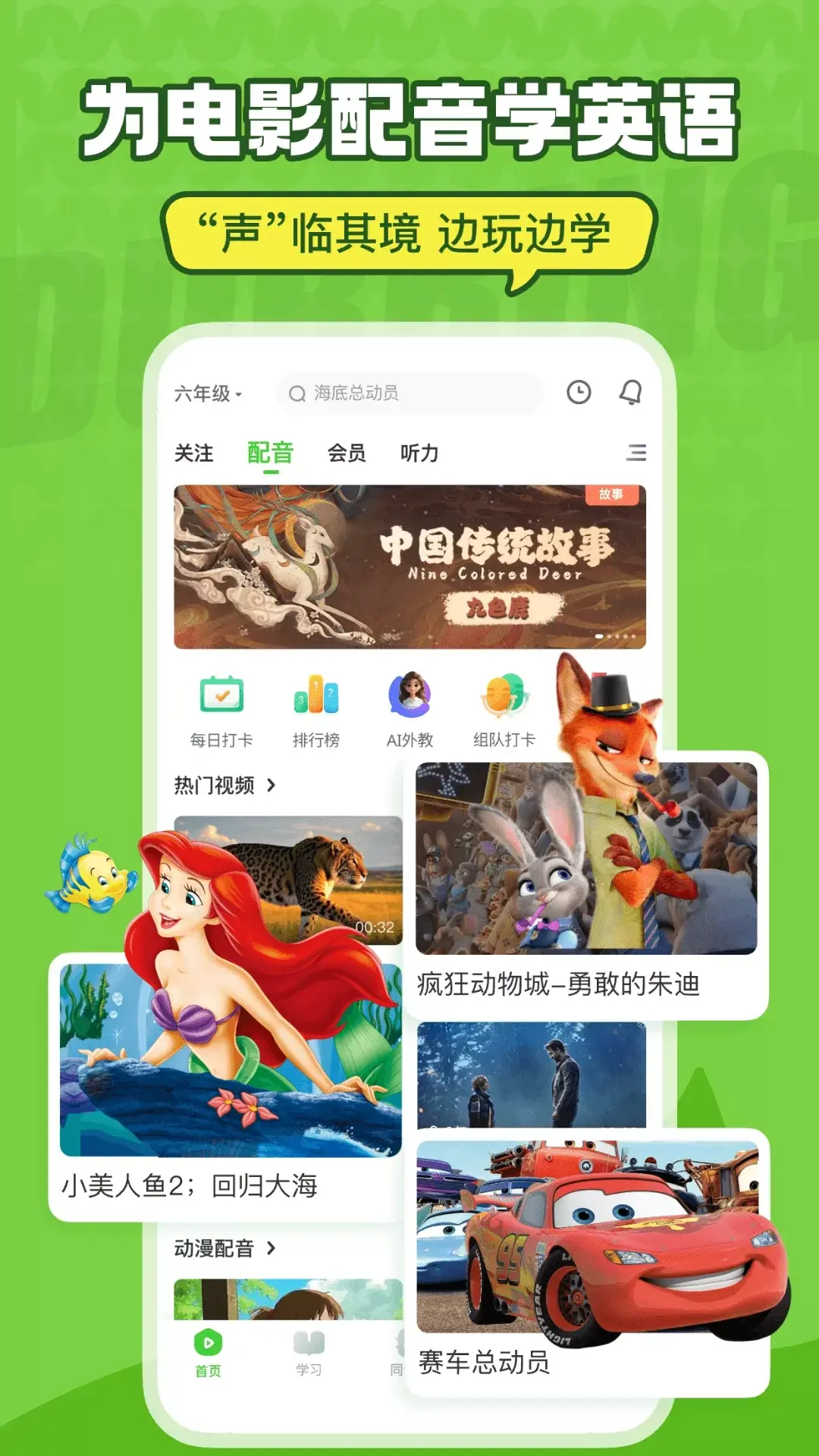 练口语就上趣配音!和1亿+小趣友一起学英语! 打通输出+输入学习闭环,让语言学习变得如此轻松好玩! AI智能学习,实时反馈+实战训练,助你告别哑巴英语! ------在英语趣配音可以做什么?------ 玩着就可以学英语! 【练口语】为经典内容配音学英语,百万素材选你选,影视剧库、热门动漫、经典动画、英文歌曲、同步教材…… 【练听力】你喜欢都可以随身听!视频一键转听力,听你想听,经典名著、必考词汇、英文演讲、历年真题…… 【背单词】百万原声视频例句,让你身临其境背单词,AI词汇私教1v1,加强词汇场景记忆, 掌握实际运用。 【同步练】教材全覆盖,预习复习两不误,萌宠AI学伴添动力,背单词、读课文、刷真题、单元测,完整科学学习闭环。 【AI语伴】AI口语陪练,中英文聊天,零基础学习,双语讲解,场景自由聊,外教一对一辅导,有趣又有聊! ------英语趣配音有什么?------ 1. 趣味形式学语言,告别传统枯燥学习法。 【看视频学】百万精彩视频,看剧学英语,与主人公原声对话,沉浸式学习! 【听歌学】经典英文歌曲边唱边学,流行歌曲、怀旧金曲、影视原声…… 【互动学】定期大赛,超多奖品等你拿,和大神切磋pk,还能邀友一起学! 【闯关学】游戏化练习,强化学习动机。知识点答疑,掌握重点难点。 【实战学】 费曼学习法,以用促学,实时任务监测,即时激励。 2. 多种趣味素材,覆盖多个领域。 【热门正版IP引入】迪士尼、小猪佩奇、巴塔木儿歌等官方正版授权,与主人公对话,身临其境学英语! 【多语种】全新日语、汉语的语种上线,更多语言学习选择。 【生词本】配音视频中的生词一键添加,覆盖语言学习生涯高频单词,加深单词场景使用记忆。 【多种词书】提供四六级、专四、专八、考研、托业、托福、雅思、GMAT、SAT、GRE等专业词书。 3. AI专业辅导,随时随地,在线学习。 【AI私教1v1】双语讲解,中英互译,例句引导,润色表达,打磨地道口语。 【专业打分】采用国家中高考口语打分系统,专业口语打分。 【实时反馈】音素级口语评测系统,AI智能算法多维点评,实时反馈发音语法问题并纠正。 【单词测试】可根据词书范围、数量、测试题型和时间速度进行个性化定制测试。 【能力测评】采用 CEFR(欧洲共同语言参考标准)框架体验研发英语能力测评,通过 5 分钟测试 10+道题,测出真实英语水平。