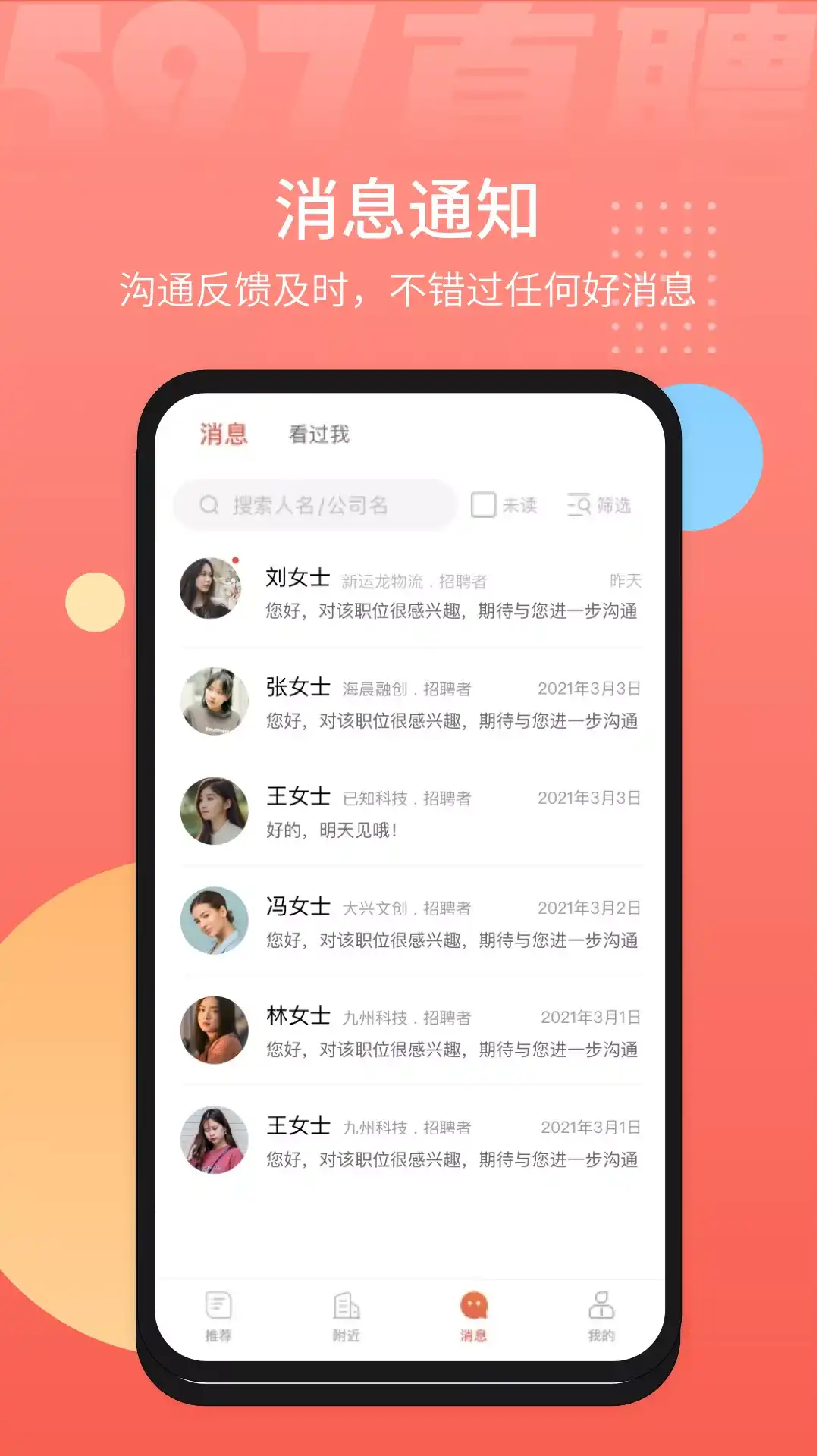 597人才网(597直聘)专注于在线求职招聘找工作,精准匹配招聘者和求职者,快速查看。随时随地,马上开聊。聊完就约,拍板快,入职快!全面海量的信息、职位让597成为100万+企业和2600万+求职者的共同选择。 每天有数十万人在这里找到工作,不等待,不犹豫,下载后马上开聊!在线聊天面试,24小时极速入职! 【职位推荐】智能职位推荐算法,让适合你的职位飞到你眼前; 【附近职位】搜索结果页可查看附近职位,找到你家附近好工作; 【职位邀请】查看对你感兴趣的企业,向你发送的职位邀请; 【职位全面】日均在线60万+职位,只要你自信; 【求职安全】设有企业屏蔽功能,完全保障你的个人隐私; 【职位准确】严格的审核机制,虚假企业零容忍; 【跳槽简单】像微信一样的app,随时随地聊HR; 【职位亮点】职位亮点纷呈展现,企业福利信息尽收眼底; 【投递反馈】跟踪求职状态,了解求职进展。接收面试通知;