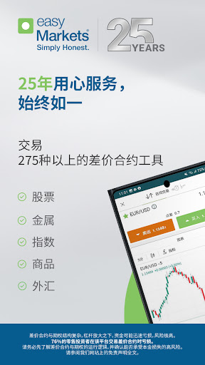easyMarkets 成立于 2001 年,秉持着一个大胆的愿景:让交易变得简单易行,人人皆可参与,同时提供领先的交易条件和专属交易工具。<br><br>多年来,我们的产品范围已从外汇扩展到全球指数、股票、金属和大宗商品,为交易者提供多元化的资产选择。<br><br><b>easyMarkets 应用程序包含以下独特功能:</b><br>✅ 可选保证止损,无滑点*,止损价位由您设定<br>✅ 标准期权:对冲波动,交易无需保证金<br>✅ easyTrade 是一种简化的标准期权(vanilla option),您的风险仅限于预先支付的权利金,而潜在回报则没有上限。<br>✅ 专为采用高级策略的交易者设计的更近的止损距离<br>✅ 极低的固定点差<br>✅ 负余额保护<br>✅ 多种账户货币包括美元、日元、英镑、欧元和澳元<br>✅ 交易超过 275 种产品的差价合约<br><br><b>我们还提供广泛的市场,包括:</b><br>➜ 外汇:交易主要和次要货币对,例如欧元/美元、英镑/美元、美元/日元、澳元/美元、美元/加元<br>➜ 全球指数:交易美国、欧盟、英国、澳大利亚、瑞士和亚洲的顶级指数<br>➜ 股票:买卖全球市场上的热门股票,例如苹果、亚马逊、特斯拉、Meta 和 Netflix<br>➜ 金属:黄金、白银、铂金、钯金、铜<br>➜ 大宗商品:石油、天然气、糖、棉花、咖啡<br><br><font color="#075C8F"><b>准备好体验交易的刺激了吗?</b></font><br>立即开始使用功能齐全、无限制的免费模拟账户,在存入实际资金之前进行交易练习。<br><br>注册只需几分钟,您可以使用 FaceID、Facebook、Google、Apple 或电子邮件轻松访问您的账户,无需密码。<br>–––––––<br><br><strong>客服</strong><br>我们的客服团队每周 5 天、每天 24 小时提供服务,帮助您获得良好的交易体验。<br><br>Easy Forex Trading Ltd 受塞浦路斯证券交易委员会(CySEC)监管(牌照号 079/07)<br>easyMarkets Pty Ltd 受澳大利亚证券和投资委员会(ASIC)监管(牌照号 246566)<br>EF Worldwide Ltd(塞舌尔)受金融服务管理局(FSA)监管(牌照号 SD056)<br>EF Worldwide Ltd(英属维尔京群岛)受金融服务委员会(FSC)监管(牌照号 SIBA/L/20/1135)<br>EF Worldwide (PTY) Ltd 受南非金融部门行为监管局(FSCA)监管(牌照号 54018)<br><br>差价合约与期权结构复杂,杠杆放大之下,资金可能迅速亏损,风险极高。 76%的零售投资者在该平台交易差价合约时亏损。 请务必先了解差价合约与期权的运行逻辑,并确认能否承受本金损失的高风险。请参阅我们网站上的免责声明全文。<br><br>* 保证止损,无滑点:使用高级附加功能保障您的交易,确保在您期望的止损无滑点。以少许额外的点差激活,实现全面风险控制。<br><br><strong>适用条约条款</strong><br><br>**easyTrade 适用专属条款<br><br>由于监管限制,美国地区的 App 用户无法使用 easyMarkets 进行交易。