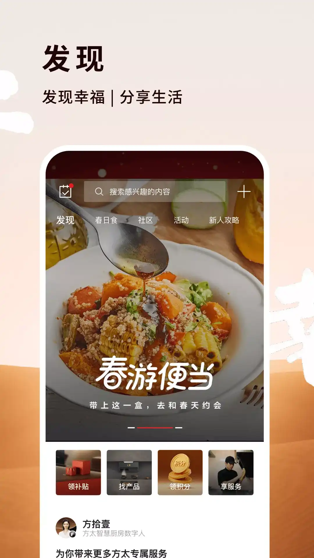 方太幸福家是一款方太用户必备APP。作为一个覆盖选购、使用、服务、交互的全场景方太用户平台, 我们提供产品使用指南、保养维修预约、智能控制连接等各类售前售后的功能服务,更有众多产品专属菜谱。 方太幸福家APP将目光聚焦于大多数的普通家庭,关心身心健康与家庭幸福,倡导高雅、乐善的生活方式。从孩子到老人,从一个家庭组建之初,到家庭不同的成长阶段,都能在这里收获幸福的指引,从而提升每一个家的幸福能量。 以家为中心,交付幸福生活方式。 【选购】一站式解决方案 通过「找产品」「看厨房」「产品对比」「热销榜单」等功能,结合丰富的场景化案例内容推荐,帮助用户从灵感到决策,一步到位;为用户提供高效、便捷、一站式的选购体验,让每一次选择都贴近真实需求,让厨房生活更有品质,也更有温度。 【使用】科技有温度,生活更从容。 智能操控 · 便捷体验:方太智能设备用户可通过APP的fiks系统控制设备,实现远程操控、语音交互,轻松掌握厨房节奏。站内提供专属智能菜谱,自动控温,一键烹饪,美味即享。还有使用指南与常见问题,为用户提供省心且贴心的售后服务。同时,APP还搭载了 HC-GPT 健康烹饪智能体,可以在线提供AI烹饪建议,让烹饪更健康、更智慧。 海量健康美食菜谱: 我们从“吃什么、怎么吃”出发,兼顾健康、美味与智能体验,希望每个人都能在这找到属于自己的饮食灵感。APP站内已收录 20000+菜谱,5000+智能菜谱,1300+美食课程。 【服务】专属福利,一站畅享 我们为方太用户提供专属的权益与贴心服务,让每一次使用都更有价值。 新人礼包:新用户可领取超值新人礼包,轻松解锁打开APP的正确方式。 会员福利:订单双倍积分、专属优惠券、不定期烟机清洗服务、积分兑换精美礼品与文创周边;VIP 用户还可畅享所有付费课程与菜谱,更有专属抽奖、节日特别活动等惊喜等你解锁。 专属耗材通道:便捷购买原装耗材,定期提醒,不错过每一次精致守护。 推荐有礼:推荐亲友购买产品或服务,对方下单,你也能获得专属奖励。 【交互】念念幸福,必有回响 每月会推出各类主题活动,围绕节日节气、健康养生、智慧烹饪、幸福家庭文化等内容,线上&线下同步进行,让交流更有温度,也更有趣。 助力一千万家庭幸福,我们一直在路上 方太幸福家,让幸福发生。