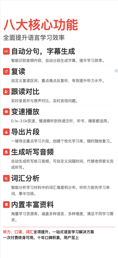 英语听读宝是一款专为外语学习和听网课打造的播放工具:支持视频和音频,支持自动断句并生成字幕、AB 跟读对比、无调变速播放,操作简洁零广告。四六级考生、播音主持学员、网校课程听力用户已使用多年并顺利通过了考试。 我们的擅长做什么: *语音识别,将分句后的句子自动生成字幕; *复读,跟读,复读次数,复读间隔都可以自定义; *变速播放; *音频词汇分析; *句子收藏; *听写音频生成; *内置听力音频; 其中: 复读次数,复读间隔都可以自定义; AB跟读,跟着音频一起朗读,结束后自动对比播放; 自动分句,将音频自动切分成若干个句子; 语音识别,将分句后的句子自动生成字幕; 通过音频波形图划定复读区间; 导出某段的音频; 内置各类型听力音频; 核心功能亮点 •【网盘支持】百度网盘,阿里网盘直连 •【视频支持】视频播放,复读 •【自动断句生成字幕】语音识别断句,每句精准呈现字幕,练习更清晰有效 •【AB 跟读 & 录音对比】自由设置复读次数和间隔,跟读后与原音比对发音差距 •【耳返】AB复读,耳返录音,原声同步对比 •【无损变速播放(0.1x‑5.0x)】音质不变调,支持任意速度,适合强化训练节奏 •【音频处理】音频切割、导出与收藏:支持录音打点、句子收藏、MP3 导出,复习记录随心管理 •【多种导入方式】多渠道导入与管理:WiFi 导入、iTunes 批量传输、iCloud 支持;文件夹分类管理,操作便捷 •【丰富内置资源】四六级真题内置:提供历年真题,贴近考试复习需求 •【极致使用体验】省电稳定体验 + 夜间模式:无广告、轻量启动快,支持定时关闭,适合夜间学习 •【收藏笔记】 收藏复读笔记,可以自动将音频切成当前时间段的小音频 •【捷径】播放ASPlay://,指定播放ASPlay://Canon,暂停ASPause://,上传ASUpload://,如需更多请访问技术支持网站或者联系我们 典型使用场景 •【英语考生】四六级、雅思、新概念、司法考试备考者,通过复读、跟读压实听力基础 •【职场进阶者】跟读演讲稿/网课音频,提升口语表达 •【兴趣训练者】影视对白、英文播音、英语故事使用无损变速精准切割练习 •【播音主持、配音学习者】精准断句+复读功能,模仿发音、练习语音语调 真实用户评价: *自动断句的功能很实用,练习英语听力再好不过了,有什么没听到的直接复读,省得一般的音频播放器上手动拉进度条还经常空降错位置。 *法考狗的福音,不跳广告不闪退。可惜百度云不能直接导入只能一个一个拷贝 很少写评论,希望软件一直能用心做下去。 *真的非常解决考试的痛点,变速甚至可以自己设置有多慢有多快,读作文文章类,一句一句的存储复读非常好用,再也不用前前后后找来找去了。而且手机录音和平板传输的时候可以选择直接用这个软件打开,不用再导了。总之,软件没广告,也没废话。对,你不花钱,也没广告,很良心。