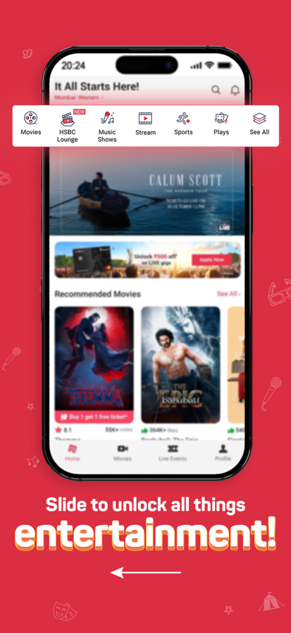 Your access to all things entertainment is here! From epic concerts and the latest blockbusters to thrilling sports, theatre, and everything LIVE, it’s all on BookMyShow. And if you live for unforgettable experiences, this app deserves a front-row spot on your phone! No matter what mood you’re in, there’s something for everyone. Whether you’re looking for the most amazing big-screen experience for the latest releases, or you want to step out with the gang for the most happening gigs in town, we’ve got it all. Oh, and did we mention that there are plenty of things to do for quality family time, too? From amusement parks to fun activities for kids of all ages, BookMyShow truly has it ALL. This year looks LIT with entertainment, thanks to upcoming Indian blockbusters like Dhurandhar, Alpha, as well as Hollywood releases like Avatar: Fire and Ash, Anaconda, Zootopia 2, Predator: Badlands, and many more! Enjoy these movies on the big screen and make the most of this experience by booking the BestSeller Seats on the BookMyShow app. You can also get exciting offers from numerous banks and wallets, and get mouth-watering Restaurant Deals that assure up to 40% off at eateries near your cinema. BookMyShow has made going out an enriching experience with big events in the country, such as Lollapalooza 2026, Bandland 2026, Travis Scott: Circus Maximus Stadium Tour in India, and Sunburn Festival ft. David Guetta, Post Malone Live in Guhawati, Papa Yaar by Zakir Khan, Vir Das- Sound of India, Nykaaland, Pitbull, I’m Back. Browse a wide range of events in your city and stay entertained. That’s not all! Discover world-class entertainment, TV series, and blockbuster releases like The Conjuring: Last Rites on BookMyShow Stream - where you don’t need any subscription and can rent/buy a title whenever you want. In summary, BookMyShow is a comprehensive online platform that allows users to discover, explore, and book tickets for a wide range of entertainment events. With its user-friendly interface, extensive event database, personalised recommendations, and secure ticketing services, BookMyShow remains the preferred choice for entertainment enthusiasts seeking seamless and memorable experiences. At BookMyShow, we take our users' privacy seriously. • Storage: We save some data locally to avoid making a lot of network calls. • Your Location: We use the location data to show you venues around you. No data is saved on our servers. • Your Social Information: We only need to read your contacts when you need to pick someone from the contacts to share the booking details. We don't save any of this data on our servers, ever. • Your application’s information & Logs: We use this to gather the information that helps us fix issues that you may experience with our app. We do not save any of this information. • Your Accounts: We require this to be able to send Push Notifications. Don’t worry, we never spam. • Your Contacts: We need access to your contacts so that you can invite your friends to chat or join you after you've booked your tickets. We ask for your contact permission for a bunch of features like chat, sharing tickets with friends. Your information will be kept confidential. • Read and Receive SMS: We need this permission to enable our app to read your One-Time-Password SMS and automatically enter the code while completing the payment. Your privacy will be respected, and no information will be saved. Download our app for FREE and book tickets on the go. Entertainment is at your fingertips. For more entertainment, follow us on social media! Need help? Head to the Help Centre page on our mobile application, and we are sure you’d find answers to any queries that may cross your mind.