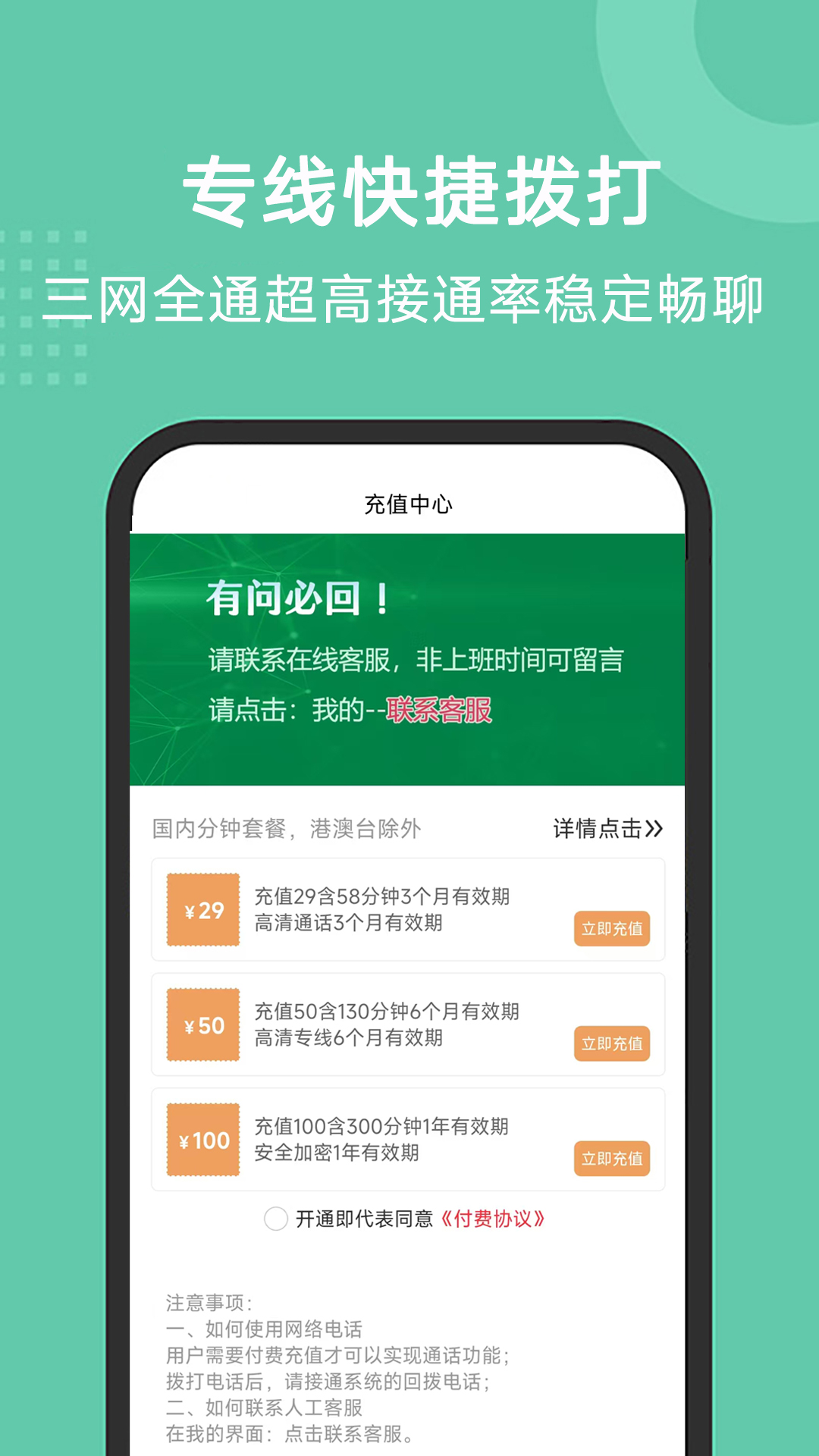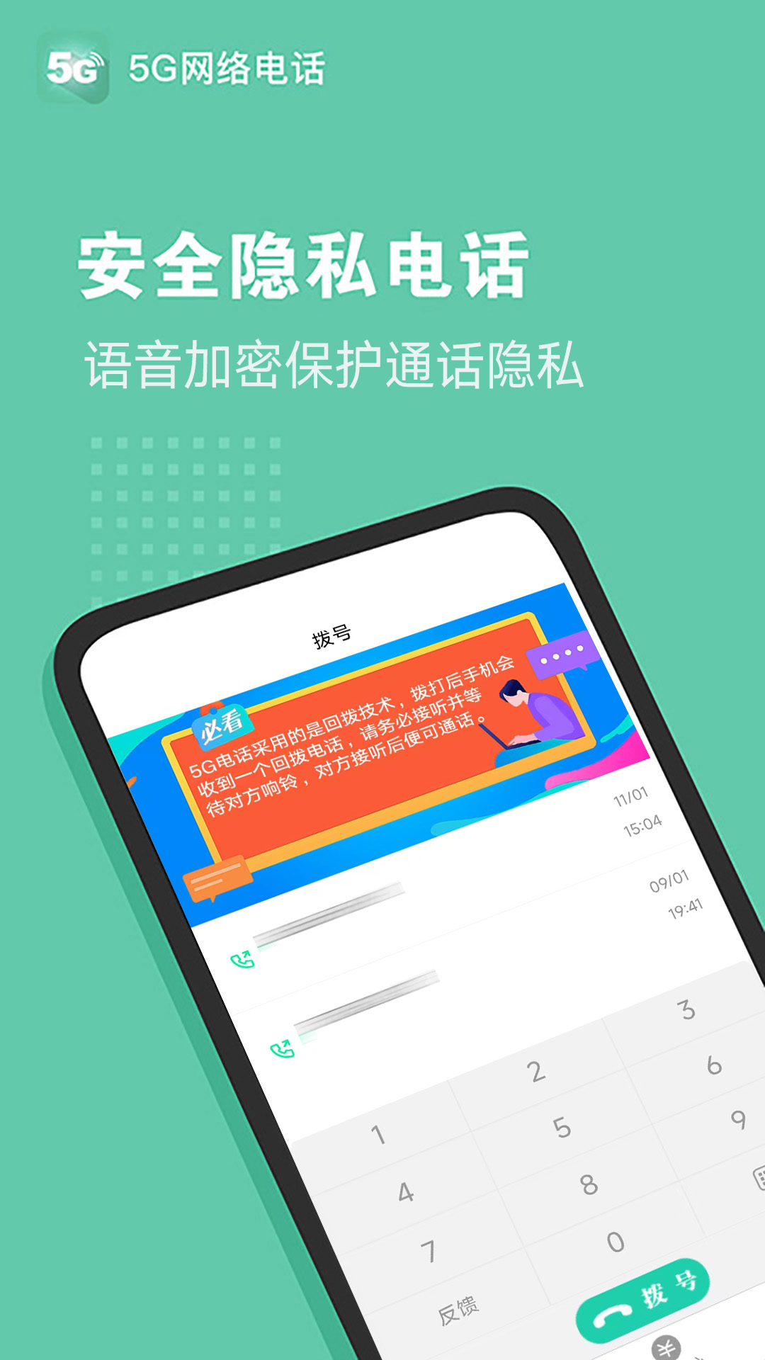 5G网络电话-是基于2025年第五代移动通信技术研发的安全智能网络电话,真正实现3G、4G、5G及wifi网络全高清省钱通话,秉承11年网络电话研发技术,保持行业至低资费、全面的功能满足您电话相关需求。<br>功能简介:<br> 【便捷】功能全面,高应答接通率高,一键即呼,对方不需要安装;<br> 【高清】固话般通话品质,超清音质,无杂音、无断线延迟;<br> 【贴心】全天候客户服务,为您解决通话各种问题;<br> 【绿色】无广告,无插件,语音加密处理,安全放心通话;