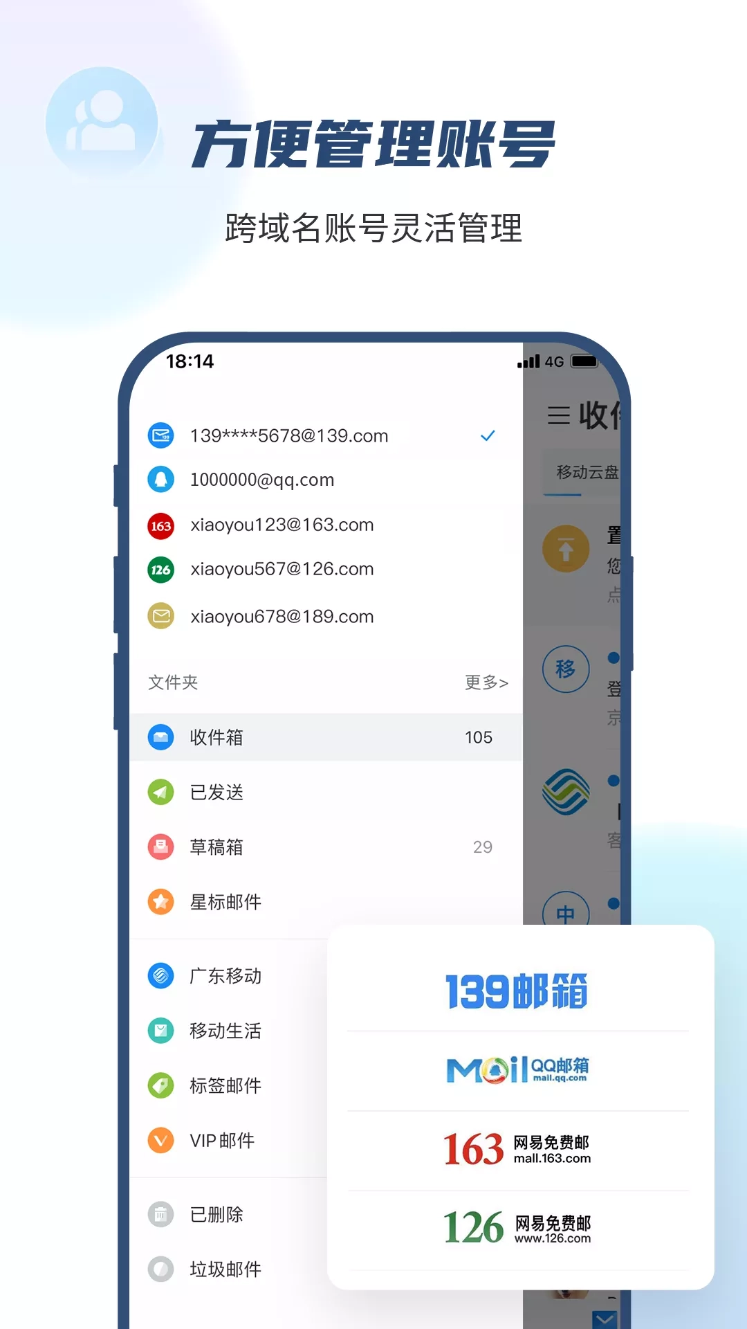 139邮箱,是邮箱也是云盘,让您得心应手收发邮件的同时,获得更多云端新体验。 安装APP您可以更便捷地收发邮件,基于移动云盘还可以安全云备份附件、微信文件、手机照片等手机资料,使用语音转写笔记、文件资料共享群,更有AI智能写作工具,助您高效办公。 139邮箱,手机号就是邮箱号,邮件+短信双重提醒,不用担心错过重要邮件! 【AI工具重磅推出】 -新增AI智能写邮件、AI总结邮件、AI回复邮件等功能,提供智能高效办公体验。 【一键免密登录】 -支持手机一键免密登录 -支持多种邮箱账号管理,一键切换账号收发邮件 【便捷收发邮件】 -无需对方邮箱号,邮件可直接通过微信发给对方 【智能云笔记】 -语音实时转文字,支持区分说话人,会议结束,纪要即出 【联系我们】 (1)关于邮箱注册问题,可前往帮助中心查看常见问题解决方案哦:https://help.mail.10086.cn/statichtml/1/index.html (2)其他问题,可通过“139邮箱App-我的-顶部右侧‘客服’”、“139邮箱App-我的-关于我们-意见反馈”或者拨打10086联系我们哦。