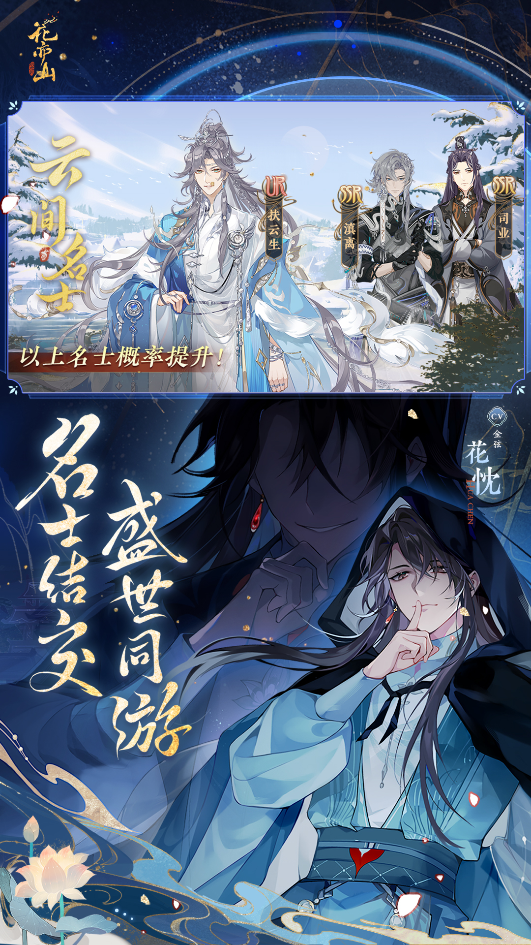 《花亦山心之月》是一款由朝夕光年自研的国风权谋群像养成手游。游戏以独特的颜彩描金画风,绘出一个古雅华贵的东方盛世;并特邀吴磊、苏尚卿等知名声优配音,国风音乐大师林海配乐,共同营造极致沉浸的声画体验。身为花家少主的“你”将结识各色名冠天下的卓绝之士,一同在皇家书院修习,体验雅致的书院生活;也将奔赴于朝堂,以权谋搅动天下风云,在乱世的漩涡中找寻治世之道,感受无尽人心…<br><br>【名士结交,盛世同游】<br>是杀伐决断的首辅,也是思想深邃的先驱; 是万人敬仰的亲王,却满怀无人理解的孤寂;世人皆说大公主气盛专强,又有谁曾得见其情纯真……与各色名士缔结盟约,解锁TA不为人知的故事,感受其中的粼粼波光与惊涛骇浪。<br><br>【权谋爽剧,风云迭起】<br>从皇家书院的闲适雅致,到朝堂之上的波谲云诡,看似平静的大景早已暗潮涌动,你能否在世家纷争的漩涡中找到治世之道?头顶风云变幻,脚下步步惊心。这一路,有明枪暗箭,更有惺惺相惜。<br><br>【颜彩金描,国风巨制】<br>以中国传统色绘制东方的古典神韵,以描金工艺勾勒盛世的雅致华贵。飞檐斗拱的亭台楼宇、恢弘壮丽的宫殿建筑,一展宣景的盛世气度;其间的岸柳飞花、碧空流云,尽显国风的无限意境。<br><br>【豪华声优,视听盛宴】<br>游戏特邀吴磊、苏尚卿、杨梦露、陶典等声优倾情献声,殿堂级国风音乐大师林海配乐,在耳端构筑纷纭世界,以听觉呈现人物悲欢,营造极致沉浸的声画体验。<br><br>【美妆华服,互动休闲】<br>点朱唇、贴花钿,自由捏脸国风美妆。理袖带、弄金钗,华服万千随心搭配。还可品茶会友,行飞花令,打理花圃,在紧张刺激的权谋斗争之余,悠享惬意的闲适时光。