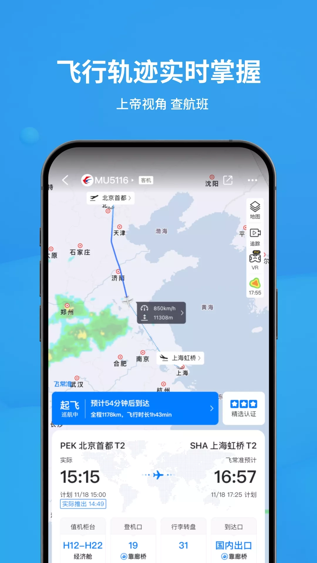 超3亿用户正在使用的出行APP 湖南卫视《天天向上》栏目强力推荐 查航班、值机选座、预定机票/火车票/酒店/接送机享返现服务 【产品功能】 精准航班动态提醒:预估航班起降时间,便于乘机人、送机人能一手掌握航班的最新动态,便于接机人合理安排前往机场接机的时间。 航班延误提前知晓:多维度的专业延误分析,让您直观了解航班延误的原因。 手机值机提前选座:支持各大航空公司的网上值机服务,提前选好心仪座位。 飞行行程全记录:航班信息自动导入,贴心管理您国内、国际飞行记录,随时查看年度排名,与飞友一较高下。 出行服务享返现:预定机票/火车票/酒店/接送机每单都返现,还有更多出行礼包,出差越多赚得越多。 机票购买,专业搜索: 更专业的机票搜索引擎,订票前可了解航班平均延误时间、靠廊桥概率、航空里程数等更多航班数据。 全方位的行程管理——支持添加航班、高铁、酒店和事件行程,便捷管理您的行程。同时支持行程共享给他人。 全球航班动态数据——每天更新全球超过98万个航班,每秒钟更新近100个航班,提供权威、准确、及时的全球航班信息。 【联系我们】 感谢您使用飞常准,使用中有任何问题可直接在“我的—意见反馈”中进行反馈,我们将在第一时间内进行处理,也可以通过以下方式进行反馈: 客服电话:4006-350-787 工作时间:7:30-00:00 官方用户QQ群:274299615