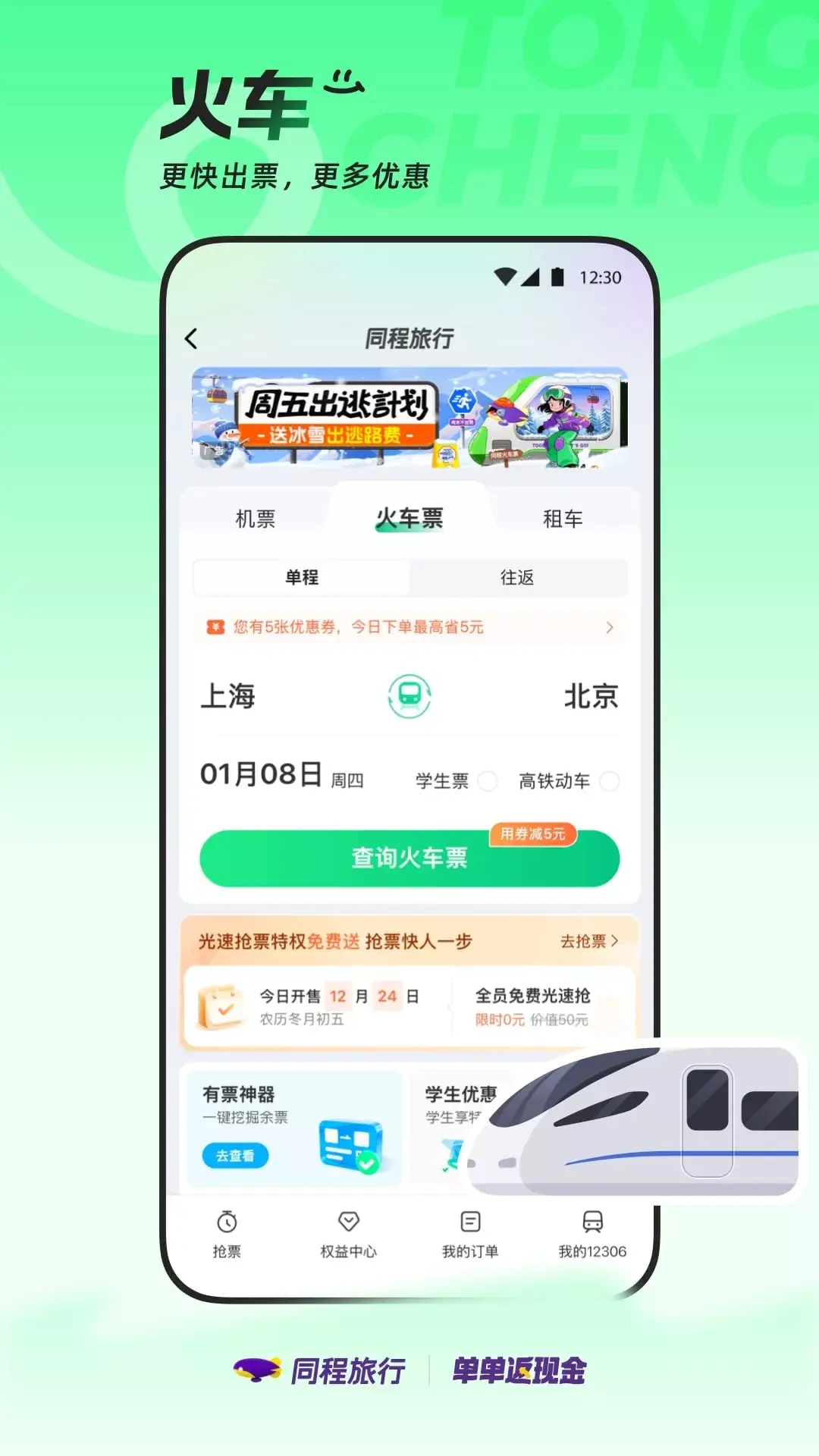 同程旅行,新一代旅行平台。 作为中国的优质在线旅行服务提供商之一,为2亿用户随时随地提供专业的机票、酒店、火车票、汽车票、门票、国内外度假线路等全方面旅游产品的在线预订服务,让用户享受更便捷、更舒适的旅行。 【产品功能】 1、新客礼包:同程旅行APP新用户可在同程APP内参与领取新客大礼包,内含国内机票、火车票、国内酒店、景点门票、汽车票、打车等新客专享红包,先领券再下单更划算,详情以活动内规则为准。 2、火车票:购票便捷,支持在线抢票、在线选座;票种多样,支持成人票、儿童票、学生票;智慧出行,智能推荐火车中转、多买几站、同车换乘等出行方式。 3、酒店:百万家酒店覆盖国内海外,钟点房/品牌连锁/民宿等多形态应有尽有,亲子/差旅/度假等多场景一应俱全。 4、机票:特价机票天天有,最低1折起;价格透明,大额优惠券天天领;免费选座,在线值机,随时掌控航班最新状态;线上退改更便捷,退改签不收取额外费用。 5、门票:全国海量景点优惠订,特价门票5折起;极速出票快乐游,免票入园不排队,无忧退订有保障;支持在线预约,无接触式购票安心游! 6、打车:一键呼叫全网打车平台,享受省心、便捷、快速、安全的