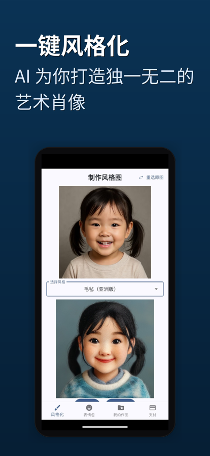 - 图片风格化:水彩、漫画、卡通等多种风格,一键生成对比图 - GIF 表情:从照片快速生成动态 GIF,可添加文字/字幕 - 高清导出:适配社交平台分享与保存 - 隐私说明:仅处理你选择的图片,不作其他用途 - 内购说明:可购买积分包(10/160/1000);风格化 1 积分/次,GIF 表情 3 积分/次