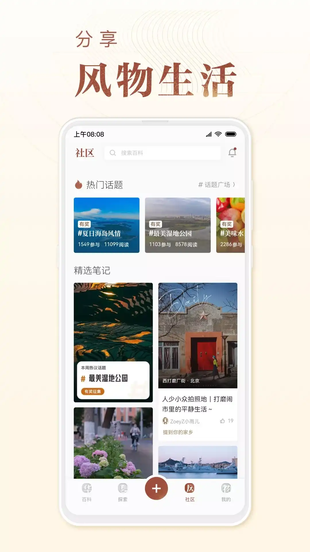 华夏风物是探索中国各地美好风物的互动平台。在这里,你可以发现每一个地方的独特物产、风景、地域文化,如蔚县的剪纸、西安的甑糕、西双版纳的雨林、上海的和平饭店等;还可以通过笔记、爆料、文章、评论等方式分享你在探索各地风物时的心得感受,让每一个人发现故乡和他乡的丰饶与奇妙,体验华夏大地的本土风物之美。 * 精选推荐:这里有全网精选风物,贴合节气,时令的美食合集,有趣的风物话题活动,在这里你可以发现华夏大地的多面美好; * 风物社区:和大家一起聊一聊那些可爱城市的小吃特产、念念不忘的美好风景、独特的非遗技艺······记录你的风物生活,分享点滴美好~ * 风物百科:这里汇集了各地特产美食、热门景点、非物质文化遗产,你可以看到专业、具体的知识解读,了解风物的真实面貌。你还可以作为风物发现官进行「风物爆料」,爆料你熟知的风物线索,完善风物百科,让更多的人认识更多新鲜有趣的风物。 * 热门城市:这里以城市为维度聚合了风物内容,你可以在这里看到你的家乡或者你向往的城市为它点赞助力,让更多的人看到它。 如在使用中遇到任何问题,可添加风物小管家微信(微信号:huaxiafengwu2020)反馈。