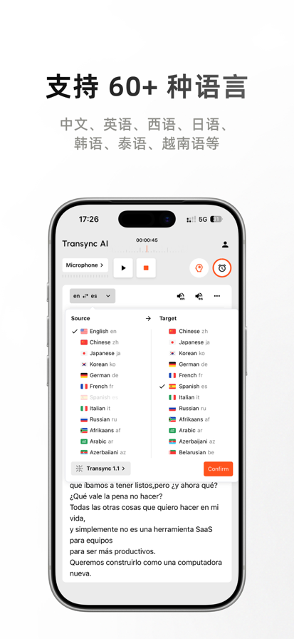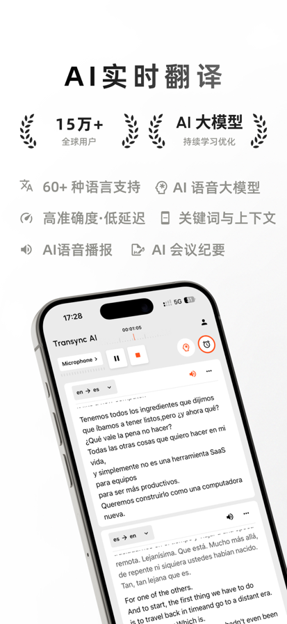 同言翻译 - Transync AI,AI 实时翻译同声传译工具,让你无缝跨语言沟通。 基于先进的端到端语音大模型,我们提供近乎零延迟的实时同声传译体验,支持60+种语言互译、双语同步显示、AI语音播报、AI翻译助手与AI自动会议纪要。多端账号互通,注册享40分钟免费试用。 【核心功能特点】 * 实时同声传译:母语表达,无需等待,近零延迟双向翻译,提升会议效率。 * 双屏双语同步显示:原文与译文分屏呈现,阅读流畅自然,理解无障碍。 * AI智能翻译助手:设置关键词、上下文,能有效提升翻译准确度。 * AI智能会议纪要:自动提取发言重点,会议记录轻松生成,支持一键导出。 * 60种语言互译支持:覆盖中文、英语、日语、韩语、俄语、法语、德语、西班牙语、意大利语、泰语、越南语等,多语种灵活切换。 * 实时语音播报:翻译内容同步语音播放,适用于各类演讲、展示与交流场景。 * 多端与会议软件适配:一个账号互通 iOS,Android,Windows,macOS;桌面端配合 Zoom/Teams/Google Meet 体验更佳。 【适用场景】 * 企业跨国会议:跨国公司、外贸企业、咨询机构、教育机构、律所等会议沟通需求。 * 学术与活动:国际研讨会、商务谈判、行业展会、线上路演与培训翻译需求。 * 个人用户:外籍工作者、留学生上课与讨论、自由职业者、旅行问询等跨境交流需求。 【为什么选择同言翻译 Transync AI?】 * 领先的 AI 语音翻译大模型,保证翻译质量与响应速度 * 独特的双屏双语设计,大幅提升理解与沟通效率 * AI翻译助手,支持设置关键词、上下文、AI会议纪要,一键生成,省时省力 * 语音播报,像真人翻译员一样伴随你一起沟通,多种音色可选 无论是正式商务、学术讨论,还是旅行日常沟通,Transync AI 同言翻译都能为您提供可靠、精准、智能的翻译体验。 【现在下载同言翻译 Transync AI】 同言翻译可以帮你在在线国际会议、线下会议与展会、留学听课交流等多个场景,实现60种语言的同声传译,自动语音播报与AI自动纪要。 官方网站:https://www.transyncai.com/ 隐私协议:https://www.transyncai.com/privacy/ 服务协议:https://www.transyncai.com/terms-of-service/