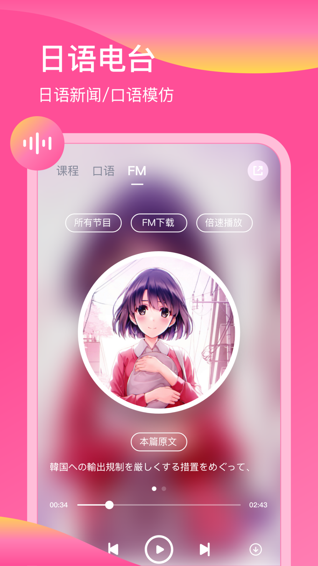 新版标准日本语会打分的日语口语老师来了!2万日语N1-N5单词大冲关,五十音图学日语,名师在线课程全力助通考试通关!<br>核心功能:<br>1. 日语学习全系列教材,从标准日本语初中级高级到大家的日本语,初中日语,高中日语等,让所有的日语教材能听会说。<br>2. 日语N1-N5单词大冲关,各个级别的2万核心词汇,还配有中文解析和例句。<br>3. 日语口语语音评测来了,据我们所知,我们是第一款日语学习语音评测APP,所有的内容等您来跟读,日语口语流利说。<br>4. 名师微课,从初级至高级,从词汇到语法课程应用尽有;名师助您在学习日语的路上高效学习,传道授业解惑。<br>5. 每日日语听力视频,精选NHK等视频新闻,看日语新闻学日语。<br><br><br>国内领先的AI日语学习平台,凭着在日语人工智能领域的专注匠心,将为大家的日语学习提供最有力的帮助!<br>如果您有任何问题和建议,欢迎加入日语学习交流QQ群:96623071,谢谢!