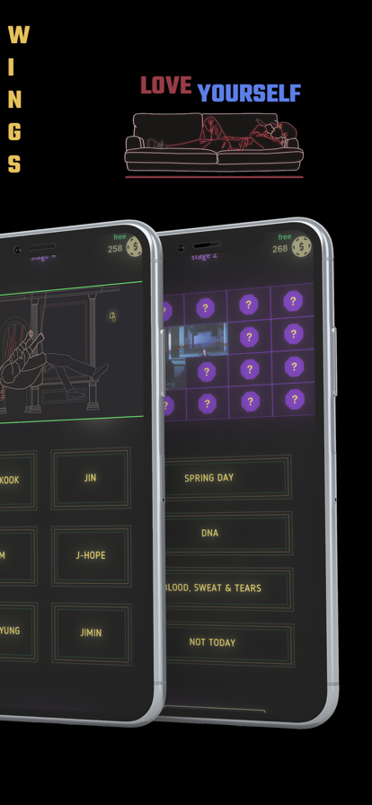 A game by A.R.M.Y, for A.R.M.Y. It’s fun, it’s free, it’s fancy! We “PURPLE” you! This app bring you a collection of 28 “DYNAMITE” mini games and a lot of “DNA” features – all about our awesome “Bulletproof Boy Scouts”. Please notice this is a fan-made product to fullfill passion with games – NOT something to help you download song, video, ticket… -------------------------------------------- FEATURE 7 CATEGORIES: *** Actions games: contain 10 games in various type: reaction, tap and jump, angle shoot, reflection, quick tap… All of them are easy to play but hard to master. *** 2 players: It’s amazing to have a friend to share fun and passion with you. Let sit down and play face to face on 1 phone – 3 mini games in this zone might help *** Puzzle: Where you can relax and have unlimited fun… 6 games in this zones are 6 journeys. You’ll find both familiar games like Find Differences, Lyrics word game and unique special games like ‘Name Tag’, ‘Eyes, Nose, Lips’... Keep comeback to check for updated levels. *** Art games: with latest music, lyrics, photo concept, MV, this zone test you with 8 games, include Quiz, Song guess, Mix and Remix song and lyrics, Wheel of song and Reverse song. *** Vibes: Include daily horoscope, news feeds and Webtoon. *** Daily mission: 3 missions a day. When you complete a mission, you’ll get a special reward, so don’t forget to keep comeback and check daily. *** Voting Tournament: Share your choices to find out what is the best by all ARMYs! --------------------------------------------- DISCLAIMER This is an unofficial fan-made application for the ARMY fandom community. It is not affiliated with or endorsed by company, management teams, or record labels.