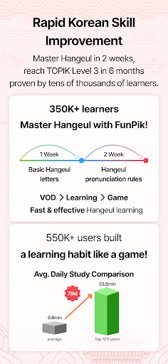 为什么选择 FunPik?<br>FunPik 项目团队始终把为所有人创造一个快速、高效学习韩语的环境作为首要目标。<br>通过针对移动端优化的学习模式和系统化课程,即使是初学者也能在短时间内掌握韩文字,并通过持续学习达到 TOPIK 高级水平。<br>结合游戏元素、任务、奖励系统以及 AI 个性化反馈的学习方式,让学习者在不感到枯燥的情况下不断成长。<br>然而,FunPik 不仅仅是学习工具。<br>我们正在打造一个涵盖韩语、韩国文化、生活与企业信息的 K-生态系统。<br>借助这一平台,学习者不仅可以学习语言,还能与来自 230 个国家的用户建立联系,获得赴韩留学、就业、品牌合作和成为 K-Creator 的机会。<br>FunPik 的目标是超越学习与成长,成为连接世界与韩国的 K-平台。<br>FunPik 的 7 大独特价值<br>🚀 快速提升韩语能力<br>使用 FunPik,仅需 2 周即可掌握韩文字,持续学习 6 个月即可达到 TOPIK 3 级水平。<br>由韩语专家设计的课程、VOD 讲座,以及分阶段的听、说、读、写内容,帮助初学者快速提高。<br>📝 最强大的 TOPIK 提分方案<br>如果您正在准备 TOPIK,FunPik 是您最可靠的伙伴。<br>全球最大的 TOPIK 题库(7,000+ 题)、类型化练习以及与正式考试相同的模拟考试,帮助您更快实现目标等级。<br>🎮 像玩游戏一样学习<br>感觉更像是在玩而不是在学!<br>通过任务、挑战和奖励系统,学习不再无聊。<br>在游戏过程中,您会自然而然地积累词汇和表达,能力不断提升。<br>🤖 AI 个性化学习支持<br>FunPik 将学习者分为 16 个阶段,AI 会推荐最适合的学习路径。<br>AI 导师会分析学习结果并提供技巧和反馈,弥补不足,就像老师一直在身边辅导一样。<br>🌍 全球成长网络<br>与来自 230 个国家的学习者一起学习,并通过排名和公会系统进行竞争与合作。<br>在这一过程中,您将获得超越语言学习的机会——赴韩留学、就业以及文化体验。<br>⭐ K-Creator 成长支持<br>FunPik 不仅提供学习,还为成为全球创作者开辟道路。<br>通过应用程序,您可以与韩国企业和品牌合作,在 K-Life 获取韩国生活与文化信息,并发展您的社交账号,成为 K-Creator。<br>💰 Play & Earn! 参与即可获得奖励<br>只需参与学习、活动、任务或挑战,就能获得可像现金一样使用的 Cash 奖励。<br>这些奖励可用于购买学习物品或通过 Follower Boost 功能提升账号。<br>FunPik – 韩语学习的新标准<br>FunPik 不只是一个应用程序。<br>它集快速提升能力、TOPIK 准备、沉浸式学习、AI 个性化、全球网络、K-Creator 培养与奖励系统于一体。<br>立即开始使用 FunPik 学习韩语吧。<br>学习韩语从未如此有趣!<br>支持语言:韩语、英语、越南语、印尼语、日语、台灣繁体中文、法语、中文、乌兹别克语、俄语、泰语、哈萨克语(未来将持续增加)。<br><br>∙ 联系方式: funpikhelp@gmail.com<br>∙ 服务条款: https://funpik.net/terms_conditions<br>∙ 隐私政策: https://funpik.net/privacy_policy