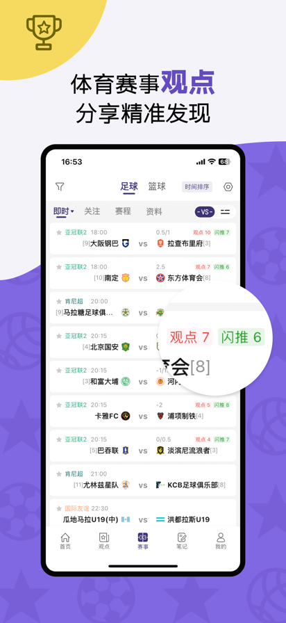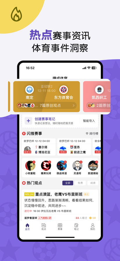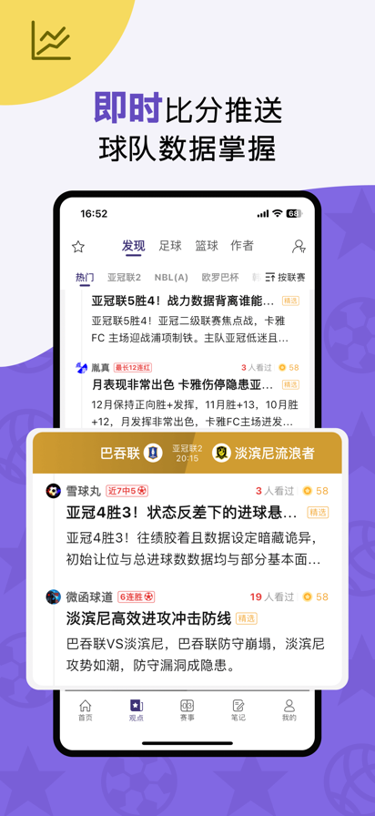 捷成体育App致力于提供国际足球篮球各大赛事的实时比分、积分榜和数据排名。我们的界面设计简洁,能够快速定位用户所关注的赛事比分,并即时更新球赛的最新比分,让用户第一时间获取比赛结果,不错过任何一场精彩赛事。 【体育迷的专属笔记本】 我们提供专业的文本笔记功能,让用户可以随时记录比赛笔记灵感。此外,独特的个性化标签、分类及提醒功能,让用户更加方便地管理关注的赛事资料,使笔记更加清晰有序。 【体育赛事多维度解读】 我们提供前瞻文章、数据统计,让用户一目了然掌握关键比赛数据。同时,通过可视化数据全方位解析赛况,为用户提供多元化、更丰富的参考解读。