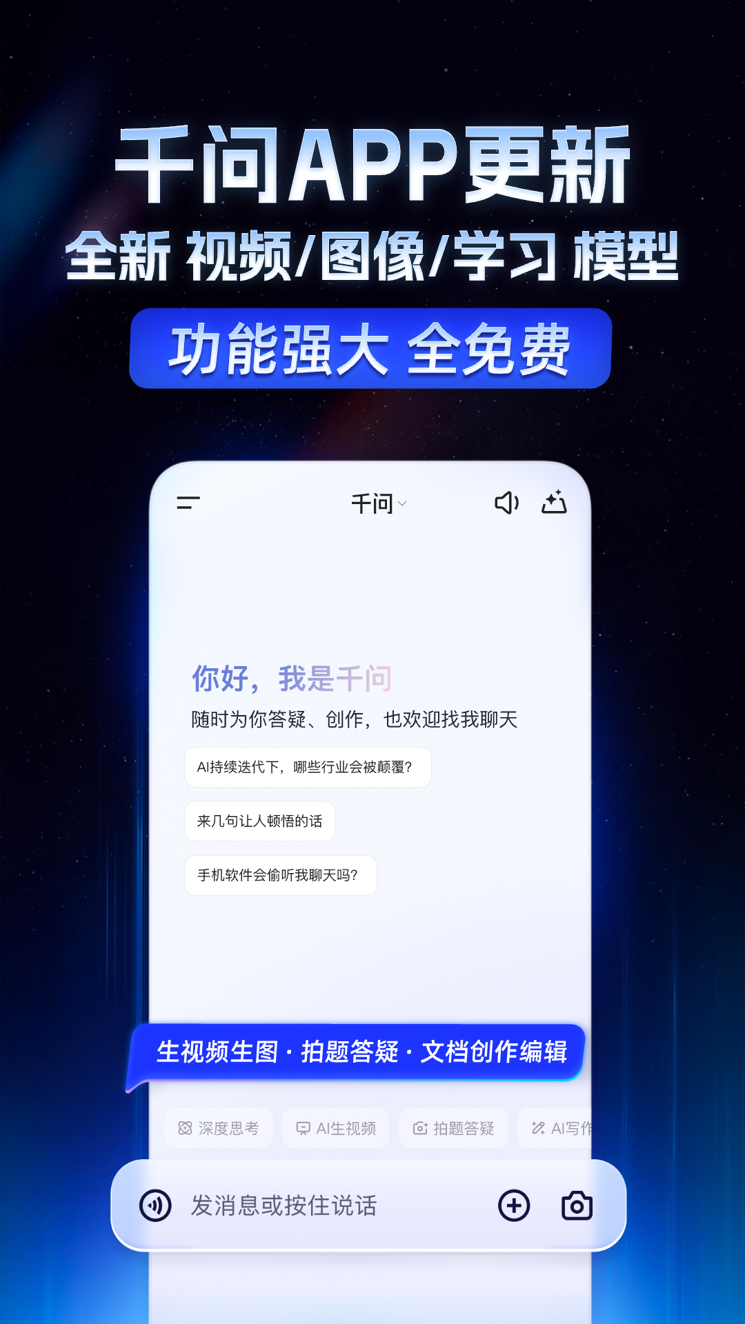 千问APP是阿里最强大模型官方AI助手,是体验最强Qwen大模型的第一入口。<br>千问使用阿里最强闭源Qwen大模型,“聪明会思考”。通过极致优化的简洁界面,让你无门槛地体验到最新AI技术带来的智能升级,旨在成为你在工作、学习、生活中的AI助手。<br>【对话问答】<br>● 超强大模型,回答更聪明<br>● 拥有优质知识源,更擅长专业领域问答<br>● 答案结构化呈现,主动推荐图表、视频辅助理解<br>【生图生视频】<br>● 最新Wan 2.5模型,生成视频长达10秒。原生支持多语言音画同步、以及更完整的叙事呈现;<br>● Qwen-Image 2511满血版,拥有强大的图像生成和编辑能力,亚洲人像更真实,中文处理更稳定。<br>【学习辅导】<br>● 全新Qwen3-Learning学习模型,解题能力覆盖全学段全学科,拍题答疑更准确;<br>● 支持作业批改,整页多题批改,秒判对错,智能生成批改小结,围绕错题进行专项讲解;<br>● 拥有5亿资料库,涵盖学习资料、试卷模板、行业报告等。<br>【智能办公】<br>● AI写作:全体裁写作,自动生成文档,智能排版;<br>● AI PPT:支持文件/图片/问答内容一键生成PPT,海量PPT模版免费选择,支持PPT导出成多格式;<br>● 智能编辑器:可在对话中直接编辑、修改生成内容,并保存下载输出,支持PDF/WORD/PPT/EXCEL多格式互转;<br>● 文档阅读:支持一次上传10个文档/图片,500页超长文也可以轻松处理。