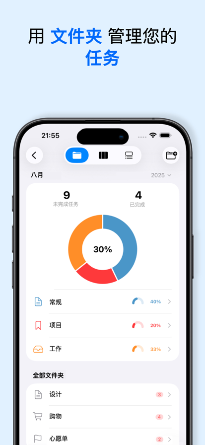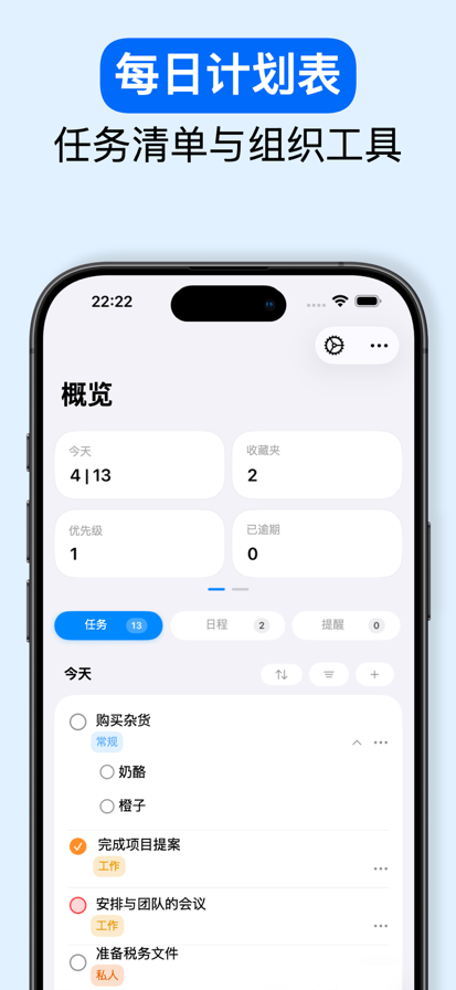 清晰的任务管理 “TaskMind”是您工作和日常生活的数字日常计划器。 轻松创建和组织您的任务。 将它们组织到自定义文件夹中并为其添加标签以组织您的待办事项。 有效的任务管理 - 再也不会忘记你的任务了。 添加子任务、图像和链接来详细说明您的任务,并将所有重要信息集中在一处。 日历视图和焦点计时器 - 使用日历视图来跟踪未完成、已完成和过期的任务。 集成的专注计时器可帮助您专注于个别任务并提高工作效率。 看板提高工作效率 - 根据经过验证的看板原则工作。 直观地管理您的任务,并使用附加标签在整个流程中移动它们。 密切关注进展并优化流程。 可自定义的文件夹和焦点选项 - 根据您的需要自定义您的文件夹,并专注于各个文件夹中的特定任务。 安排好你的工作并保持专注。 无缝数据导入和导出 - “TaskMind”可与 iOS 日历和提醒应用程序进行无缝数据交换。 轻松从 iOS 日历应用程序和提醒应用程序导入任务,以便在 TaskMind 中管理它们。 同样轻松地将您创建的任务导出回 iOS 日历或提醒应用程序 通过 iCloud 同步轻松共享数据 - “TaskMind”提供与 iCloud Sync 的无缝集成。 您的任务将在所有 Apple 设备之间自动同步。 在 iPhone、iPad 或 Mac 上无缝地处理您的任务,并始终保持最新状态。 立即开始您的高效规划 - 探索“TaskMind”并有效地组织您的日常生活和工作。 立即开始您的高效规划并始终保持概览!