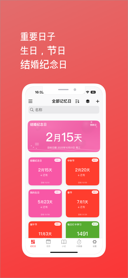 「记忆日 最美时光」 「应用介绍」 家人的生日都是哪天?我已经坚持早起了多少天?距离发工资还有多少天?每年春节都发生了哪些有趣的事? 这些问题您是否也经常面临呢?是否有比在笔记本里记录更好的方法呢? 记忆日是一个帮你记录重要日子的小应用,他能把你最在乎的东西记录下来,不错过任何一个美好的时光,通过它您能对重要的日子做到心中有数。 「场景举例」 - 记录父母伴侣孩子的生日 - 孩子已经出生了多少天 - 准备结婚了,一路走来都发生了什么 - 每周五提醒我写工作周报 - 每年结婚记忆日提前十天提醒我买礼物 ... 「功能简介」 1. 新建记忆日,支持分组管理,同事支持重复,支持目标日前提前 2. 农历,公历两种时间都支持 3. 日期支持自定义背景,相册,相机,系统内置三种可选 4. 分组管理,在侧滑抽屉中长按分组,可以进行任意拖动排序 5. 分享记忆日可以生成实时记录图片,让大家一起分享充实的喜悦 6. 外观自定义,同时支持浅色,深色两种外观样式 7. iCloud云端同步:保护你的重要资料 8. 个性化设置,自定义启动图,自定义APP 图标 9. 密码解锁, 支持面容,指纹,图形锁,密码解锁 「意见反馈」 我们非常需要您使用后的意见和建议,共同让APP更加贴切地满足大众需求。 如果您觉得记忆日能够帮助到您,麻烦在AppStore 中给出好评,并且分享给您的朋友 「应用程序订阅」 您可以订阅以获得访问所有记忆日高级功能的权限,可以在「设置」中找到该功能,订阅该服即可成为Pro用户,开始无限制使用全部功能,包含未来新增的功能。 当前我们为该服务提供了10元每月、30元半年、48元每年的标准服务价格,该价格可能会在以后有所变化。当价格调整发生时,新的费用将会在您的下一个订阅周期发生。 在每个订阅周期即将结束时,您的订阅默认将自动续费,除非您明确自行取消自动续费,或者由我们取消该服务。您可以通过该服务的「管理订阅」处自行取消自动续费功能。 ●费用将在确认购买后从iTunes帐户扣除 ●订阅是自动续期的服务,若不打算续期,请在当前计费周期结束前至少24小时手动关闭 ●续期的费用将在当前周期结束前的24小时内扣除 ●订阅后可以在AppStore的账户里提供的「订阅」入口进行管理续费周期等操作 使用条款: https://coding.net/s/821747b5-faac-4436-8d74-e2f19ba2210d 隠私策略: https://coding.net/s/76bb4daa-d3a8-4a99-a8cb-11bdbaa8b023