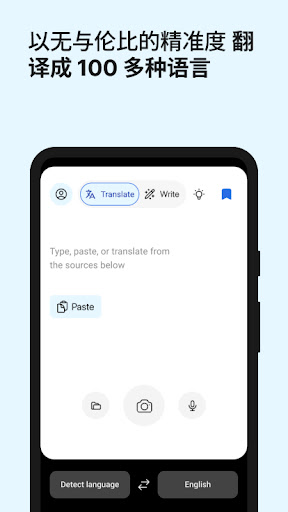 - 相机翻译:用相机拍摄照片,即时获取文本翻译<br>- 照片翻译:上传照片,翻译其中的文本<br>- 听写:边说边译<br>- 文字转语音:语音播放译文内容<br>- 文件翻译:翻译文件中的文本<br>- 快速检测:边输入边翻译<br>- 备选译文:查看单词和短语的替代选项<br>- 收藏:保存单词和短语以便日后查阅<br>- 历史记录:轻松查找、编辑和重复使用过去的译文<br>- 转写:用拉丁字母阅读日语、俄语等非拉丁语系语言的译文<br>- 术语表:翻译由你或所在机构定义的关键词和短语(付费计划可用)<br>- 语气:选择正式或非正式语气(付费计划可用)<br>- 手写:手写文本字符代替输入(iPad 可用)<br>- DeepL Write:获取智能写作建议,轻松创建清晰无误、有影响力的文本<br><br><br>功能支持因语言而异。目前可用:阿非利卡语、阿尔巴尼亚语、阿拉伯语、阿拉贡语、阿萨姆语、阿塞拜疆语、爱尔兰语、艾马拉语、爱沙尼亚语、奥克语、巴什基尔语、巴斯克语、白俄罗斯语、邦阿西楠语、邦板牙语、保加利亚语、冰岛语、博杰普尔语、波兰语、波斯语、波斯尼亚语、布列塔尼语、茨瓦纳语、聪加语、达里语、丹麦语、德语*、俄语、法语*、梵语、芬兰语、盖丘亚语、格鲁吉亚语、古吉拉特语、瓜拉尼语、哈萨克语、海地克里奥尔语、韩语*、豪萨语、荷兰语、吉尔吉斯语、加利西亚语、加泰罗尼亚语、捷克语、克罗地亚语、科萨语、孔卡尼语、库尔德语(库尔曼吉语)、库尔德语(索拉尼语)、拉丁语、拉脱维亚语、立陶宛语、林加拉语、卢森堡语、伦巴第语、罗马尼亚语、马达加斯加语、马耳他语、马拉地语、马来语、马其顿语、迈蒂利语、毛利语、蒙古语、孟加拉语、缅甸语、尼泊尔语、挪威语(书面挪威语)、普什图语、葡萄牙语*、葡萄牙语(巴西)*、日语*、瑞典语、塞尔维亚语、世界语、斯洛伐克语、斯洛文尼亚语、斯瓦希里语、塔吉克语、塔加洛语、塔塔尔语、泰卢固语、泰米尔语、土耳其语、土库曼语、威尔士语、沃洛夫语、乌尔都语、乌克兰语、乌兹别克语、希伯来语、西班牙语*、西班牙语(拉美)、希腊语、西西里语、匈牙利语、宿务语、巽他语、亚美尼亚语、亚齐语、伊博语、意大利语*、印地语、印尼语、英语(美式)*、英语(英式)*、粤语、越南语、爪哇语、中文(简体)*、中文(繁体)*<br>*DeepL Write 同样可用 <br><br>免费下载——免费使用核心功能!<br>- 使用 DeepL 账户,享受更多翻译功能<br>- 通过 SSO 登录团队账户<br>- 要解锁所有功能,需要 DeepL 付费计划<br><br>像每天数百万用户一样,随时随地使用 DeepL 安卓版,跨越语言障碍,轻松进行交流。<br><br><br>条款和条件:https://www.deepl.com/zh/app-terms<br><br>隐私政策: https://www.deepl.com/zh/privacy.html <br><br>DeepL 客服:https://www.deepl.com/zh/support