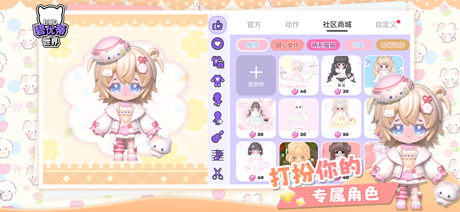 BUD国服,重磅回归! 欢迎来到BUD-碧优蒂的世界 ,释放你的3D创造力!跟着BUD一起进入奇幻3D世界,让想象力和创造力成为现实!BUD不仅仅是一款游戏,更是一个充满创意和探索乐趣的3D互动内容世界,让想象力引领你前行。加入这个拥有数百万玩家的社区,体验在广阔的 3D 世界中将你的想法变为现实的快感。 【打造独一无二的专属服饰】 使用我们丰富的设计工具,开启你的时尚设计之旅。 多种服装模板随你挑选,自定义调色盘让你尽情发挥创意,打造属于自己的独特风格。从古典到现代,从日常到高定,你将有无限的创意空间,展现你的设计才华。快来挑战自己,打造属于你的时尚帝国! 【建造生动有趣的3D地图】 利用我们易上手的3D工具,创造你的梦想地图世界。 你可以选择各种基础模具和逻辑道具,打造独具匠心的地图,让玩家们畅游其中。无论是绚丽迷人的风景地图,还是趣味十足的闯关跑酷,超高的自由度让你可以尽情发挥想象力,创造出不同氛围的地图。快来释放创意,设计专属于你的独特地图! 【探索繁华热闹的互动社区】 深入我们内容丰富的社区,找到你的志同道合之友。 在我们充满活力的社区市场中,你可以探索到由BUD玩家所创造出的多种风格的服饰和各种类型的地图。此外,你还可以在地图中结识志同道合的朋友,与好友一起畅享游戏中的互动乐趣。快加入我们,一起探索无尽的乐趣! 【联系我们】 - 官方邮箱:contact@pointone.tech - 官方抖音:BUD-碧优蒂的世界 - 官方小红书:BUD-碧优蒂的世界 - 官方快手:BUD-碧优蒂的世界
