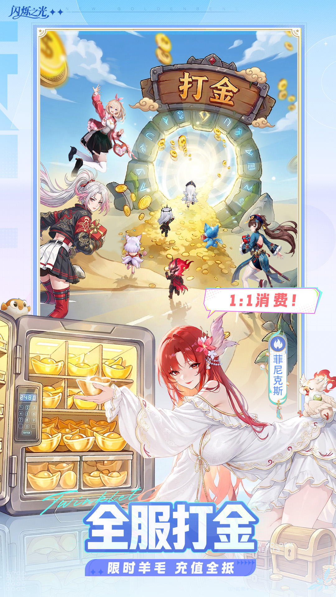 暗系全新输出王正式登场!闪耀淘金专服火爆开启!<br>福利大升级——新服签到送双SP英雄!强力英雄,零氪带走!<br>阵容新体验——灵系开局光暗下放!高阶阵容,抢先体验!<br>全服掏真金——限时代金券1:1抵充值!百万金矿,畅爽开挖!<br>版本新限定——专属称号【闪耀淘金】免费送!错过不再有!<br>减负再升级——双倍金币副本,扫荡能力增加,自动远航,无损召回,应有尽有!<br>SP霍德尔登场——暗系全新输出王今日登场!无限叠伤,一击成神!