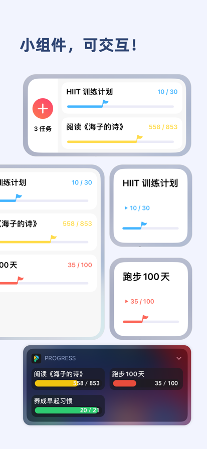 Progress:管理任务进度、食材余量。 「应用介绍」 这本书看到了第几个章节?我已经坚持早起了多少天?我的鸡蛋还剩多少个? 这些问题您是否也经常面临呢?是否有比在笔记本里记录更好的方法呢? Progress是这样一款简洁设计的APP,与您共同管理日常进度,提高目标的达成效率。 很多时候耐心和无趣打断了我们记录的脚步,Progress用简洁的交互和高颜值的设计,避免了这个问题。您可以在APP内进行各项目标的进度管理,在完成之后,可以在社交媒体分享您的目标完成情况。当然,也可以在Today中进行快捷的管理,比如进度+1的操作。 「场景举例」 - 记录电视剧看到了第几集 - 这本书看了多少页,还剩多少没有完成 - 早起目标21天的目标完成了多少 - 牛奶还剩多少罐呢 ... 「功能简介」 1. 新建、管理您的任务,让它们变成漂亮的卡片 2. 多种方式增加您的进度,直至任务完成 3. 小组件上展示、管理这些任务 4. 分享高颜值的进度卡片,让大家一起分享充实的喜悦 5. 惊艳的图标、主题供选择 6. 支持iCloud备份、恢复数据 「意见反馈」 我们非常需要您使用后的意见和建议,共同让APP更加贴切地满足大众需求。 如果觉得Progress在某个点有打动到您,希望得到您的好评,并且分享给您的朋友哦~ --- 「关于会员」 订阅付费后,您将成为Progress会员,享受更多专属特权。 付款:确认购买并支付后,权益将计入iTunes账户,并将通过您的iTunes账号自动续订。 续订/自动续订:苹果iTunes账户会在到期前24小时内扣费,扣费成功后订阅周期顺延一个订阅周期。 取消续订:如需取消续订,请在当前订阅周期到期前24小时以前,手动在iTunes/ApplelD设置管理中关闭自动续费功能。 「政策」 隐私政策:https://www.privacypolicies.com/live/7b3e2c73-314a-4793-a87a-d5c1423b8cb3 使用条款:https://www.apple.com/legal/internet-services/itunes/dev/stdeula/