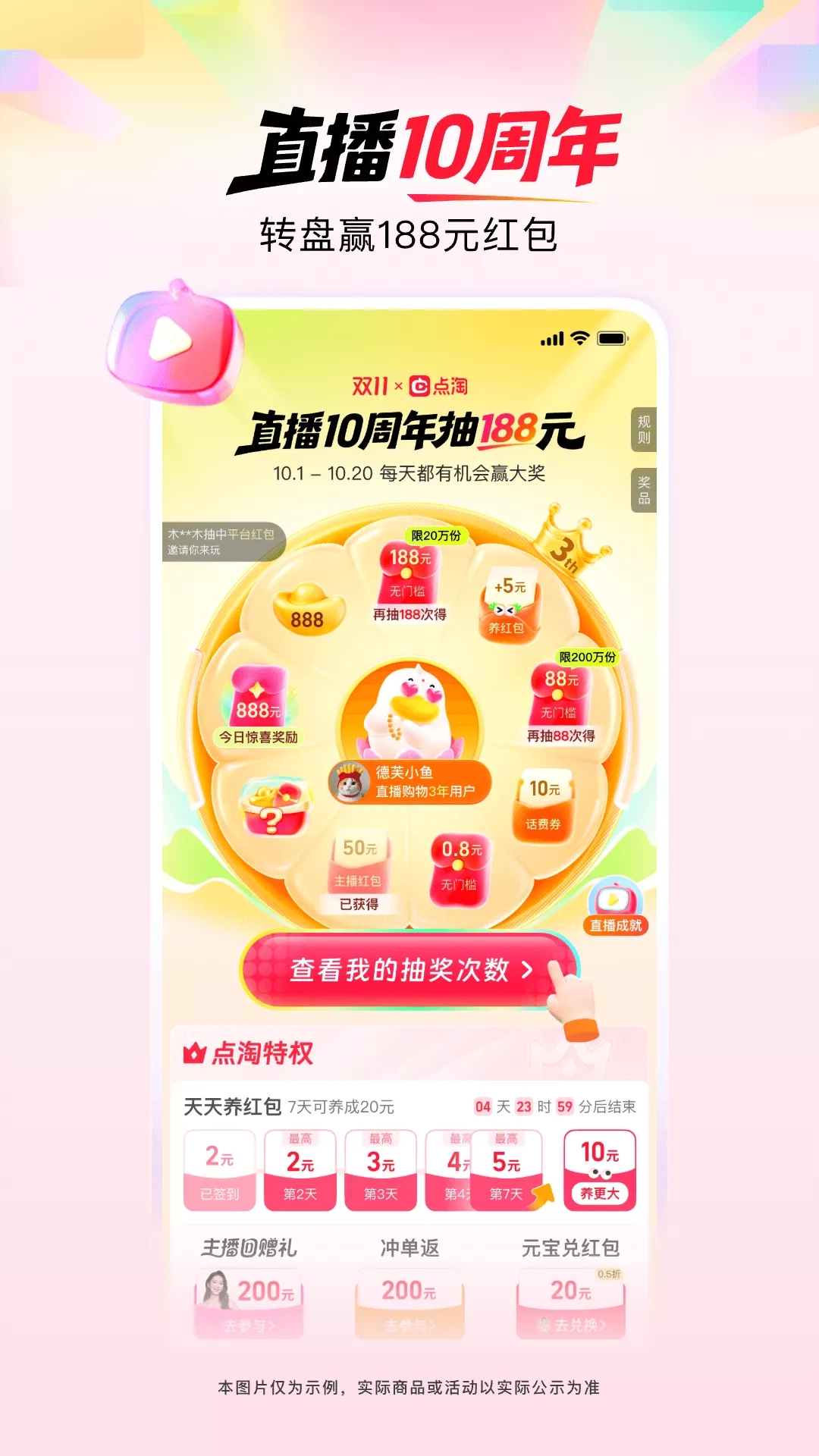 点淘APP,追剧剁手党一定不能错过的宝藏app,超多主播达人推荐良心好物、分享生活攻略,一起涨姿势、添满美好buff。直播间红包雨优惠券加持,大牌秒杀,折上折更优惠,从此告别购物犹豫不决。 汇聚超多热门短剧,甜宠现言、古装重生、仙侠玄幻等多种题材应有尽有,轻松找到心仪的剧集,高清画质无广告干扰,观影体验更加畅快! 【爆款短剧,随时畅享】短剧爱好者的天堂,涵盖海量爆款短剧,题材丰富,制作精良,再也不用担心剧荒啦! 【直播开启新世界,淘好物逛不停】 亿万网民的选货达人汇集于此,为你甄选更优质的商品,为你提供更优惠的价格,还有明星空降直播间,万千主播总有你的pick。开蚌、开翡翠原石、撸猫遛狗,打开奇奇怪怪可可爱爱的新世界大门,新奇有趣近在眼前。 【趋势热榜榜单,走在流行前沿】 又火又潮又时尚,尽在趋势热榜。吃喝玩乐、穿搭美妆,一手新鲜话题让你成为时尚弄潮儿、冲浪小能手。 【挚爱粉集聚地,给你喜爱的主播打call】 亲密度翻倍,助力值翻倍,快速升级挚爱粉,帮助主播冲榜升级。疼爱你的主播,就用点淘APP。