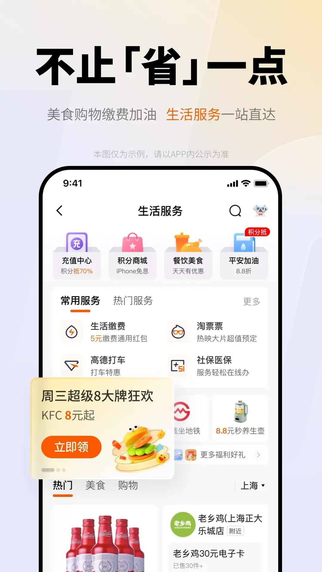 交通银行信用卡买单吧 买单吧是交通银行信用卡官方手机客户端,全面满足你对支付、金融与生活服务的需求。无论你是否为交通银行信用卡持卡人,只要输入手机号即可完成注册,充话费、叫外卖、看电影,优惠多多。每日登录即可抽取积分大奖,还有惠频道天天花式送礼,奖品拿到手软! 【买单吧主要功能】 信用卡服务:办卡、查账、额度、积分、还款、白金特权,7*24小时随时为你服务。 消费信贷:分期还款,畅享消费,倍感轻松。更有现金分期、消费贷款供你选择。 生活服务:美食、电影、充值、缴费、叫外卖,缤纷生活,应有尽有。 惠频道:千万用户福利中心,一手优惠讯息每日发布,用卡、积分、薅羊毛攻略全掌握。 【买单吧主要功能】 信用卡服务:办卡、查账、额度、积分、还款、白金特权,7*24小时随时为你服务。 消费信贷:分期还款,畅享消费,倍感轻松。更有现金分期、消费贷款供你选择。 生活服务:美食、电影、商城、充值、缴费、叫外卖,缤纷生活,应有尽有。 福利社:千万用户福利中心,一手优惠讯息每日发布,用卡、积分、薅羊毛攻略全掌握。