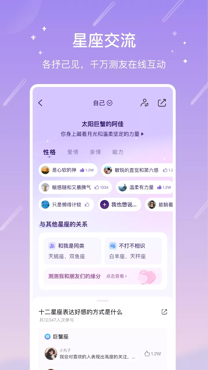测测是一个帮助用户认知自我,积极生活的app。 在测测,你可以与不同的AI智能体、众多测友和认证达人展开深入的互动交流,无论是探讨星座、MBTI,或者分享情感的点滴,还是讨论日常生活的方方面面,每一次的互动都能让你更深入地了解自己,增强面对生活挑战的信心和动力。 来测测,遇见更好的自己。 ===测测主要特色=== 【MBTI焕新上线,趣味解读好友圈】 i人还是e人?解读结果更多元; 新增互动讨论区,与测友畅聊新发现; 和微信好友进行MBTI合盘,一键解锁默契度; 查看好友MBTI,朋友圈16种人格分布一目了然; 【开放社区 分享心情 广结测友】 兴趣交友,精准匹配,和自己喜欢的测友一起交流分享; 话题丰富,多个领域知识任你参与; 情感互助,众多热心测友一起温暖你的心灵; 【心理倾诉 心理树洞 心理沙盘】 心理达人7*24小时在线谈心随时陪伴你; 心理树洞,再小的声音也有人聆听; 心理沙盘,专业达人解析投射的心理世界; 【星座分析 心理测试 个人报告】 必备的专业星座分析工具,多维度认识自己; 专业不乏趣味性的50+心理测试; 专业知识+精细算法的个人报告;