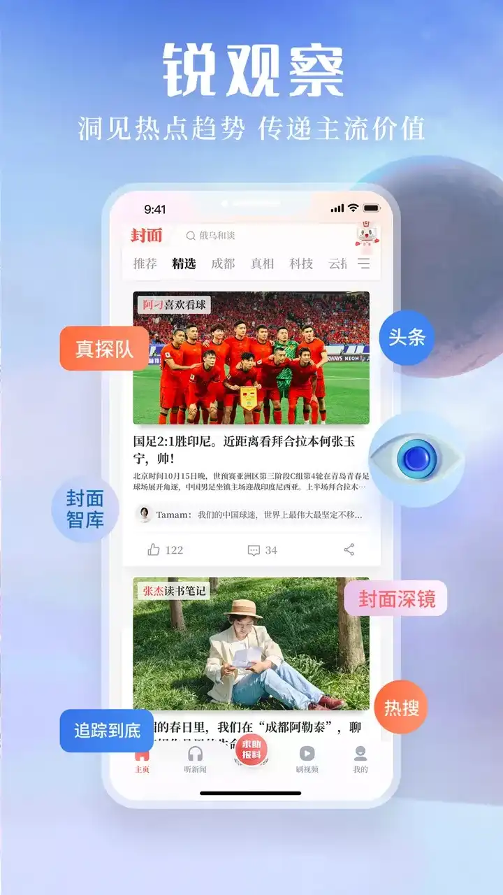 封面新闻是一款面向年轻人的新闻类App,它以前沿科技为驱动,以原创及资深报道为基础,致力于在不同场景下,为不同兴趣的人推荐不同类型的内容。视听读聊,多场景覆盖用户的使用需求;精选频道,洞悉深度品质内容;封面热搜,聚焦全网实时热点;求助报料,为用户提供全方位云服务;智库服务,聚焦网络热点,提供决策参考;青蕉社区,加入兴趣圈子,参与话题互动;智聊小封,联接美好生活。封面新闻——亿万年轻人的生活方式。 【产品特性】 1、智能推荐,个性阅读 兴趣由你选择,内容智能推荐;语义分析,智能推荐,以机器算法为支撑,以用户需求为导向,通过专业的兴趣引擎对用户进行精准画像,为用户从海量内容中推送最感兴趣的资讯内容。 2、视频直播,影响爆发 丰富视频内容,流畅的沉浸式视频观感,年轻态的视频社交方式,极大提升用户观看视频体验。多视角直播,全方位呈现;VR直播,结合直播与虚拟现实,让你身临其境感受现场。 3、用户服务,互动升级 网上群众路线服务平台,为你提供求助、投诉、举报、报料等全方位服务;你还可加入感兴趣的圈子,关注你感兴趣的用户。观看有趣的视频,参与热门互动。 4、智聊小封,联接生活 全新上线的封面新闻1
