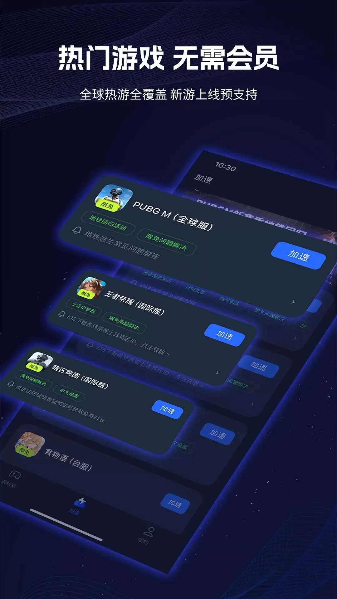 【 热门游戏,“游”先支持】 支持PUBGM、王者荣耀国际服、使命召唤战区、绝地求生:刺激战场、吃鸡外服、鹅鸭杀手游,暗区突围国际服、飞机大厨、咒术回战、宝可梦大集结、战地手游、瓦罗兰特手游、剑灵2、英雄联盟手游(lol:wild rift)、云顶之弈手游等游戏加速! 【海量手游库 新游上线快 】 支持PUBGM、王者国际服、使命召唤战区、星际战甲国际服、炉石传说国际服、暗区突围国际服、飞机大厨、对峙2、云顶之奕、鹅鸭杀、赛马娘、pubg2、暗黑破坏神不朽、apex手游、二之国、全境封锁手游、战地手游、瓦罗兰特手游、绝地求生刺激战场全球服、使命召唤手游全球服、八方旅人、符文大地传说、Among US、游戏王、方舟生存进化、黎明杀机、公主连接、冒险岛M、地球末日生存、Teon中文版、剑灵:革命、战争机器人、地牢猎手5、FIFA、碧蓝幻想全球服、iron force、世界计划、多彩舞台、第七史诗(epic 7)、和平精英全球服、堡垒之夜、fgo、影之诗、失落龙约黑色沙漠、文明重启全球服、荒野乱斗、狂野飙车9等游戏加速!游戏库包罗千款好玩游戏,热游新游排行一目了然。平均每天3款游戏的速度上