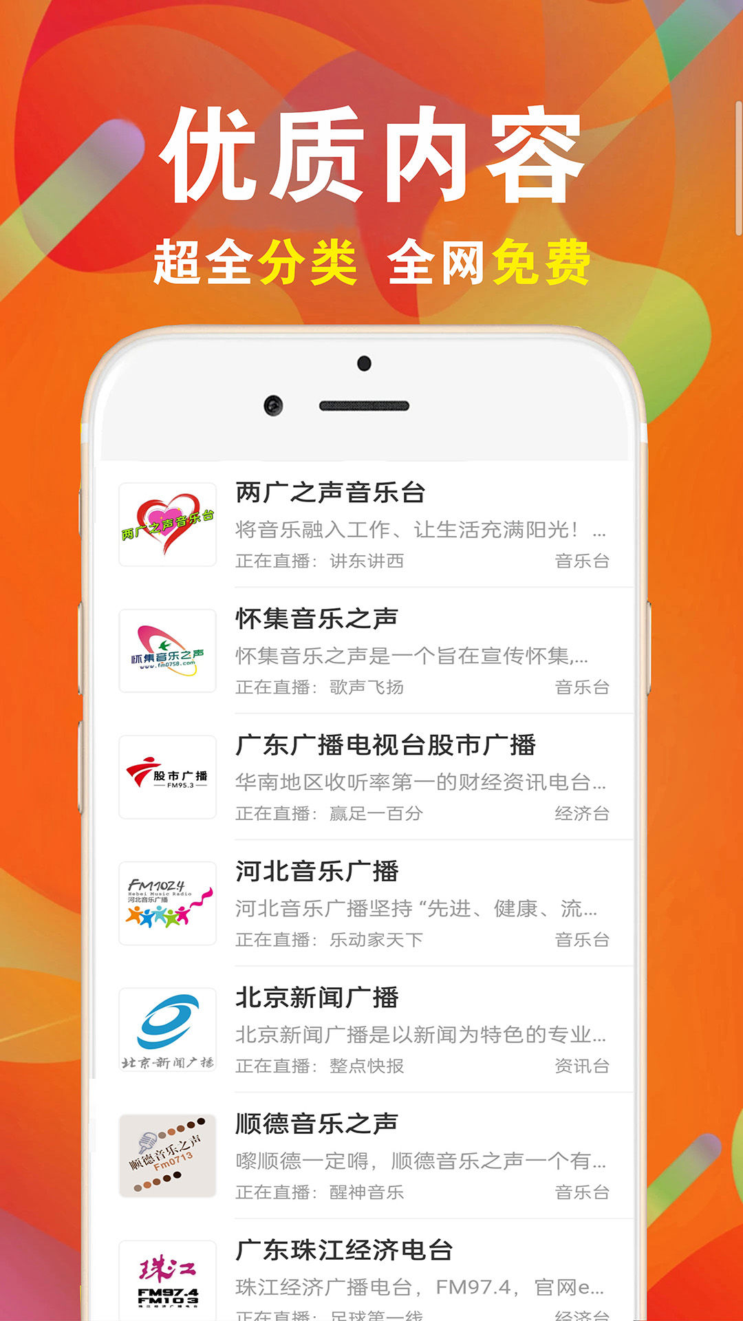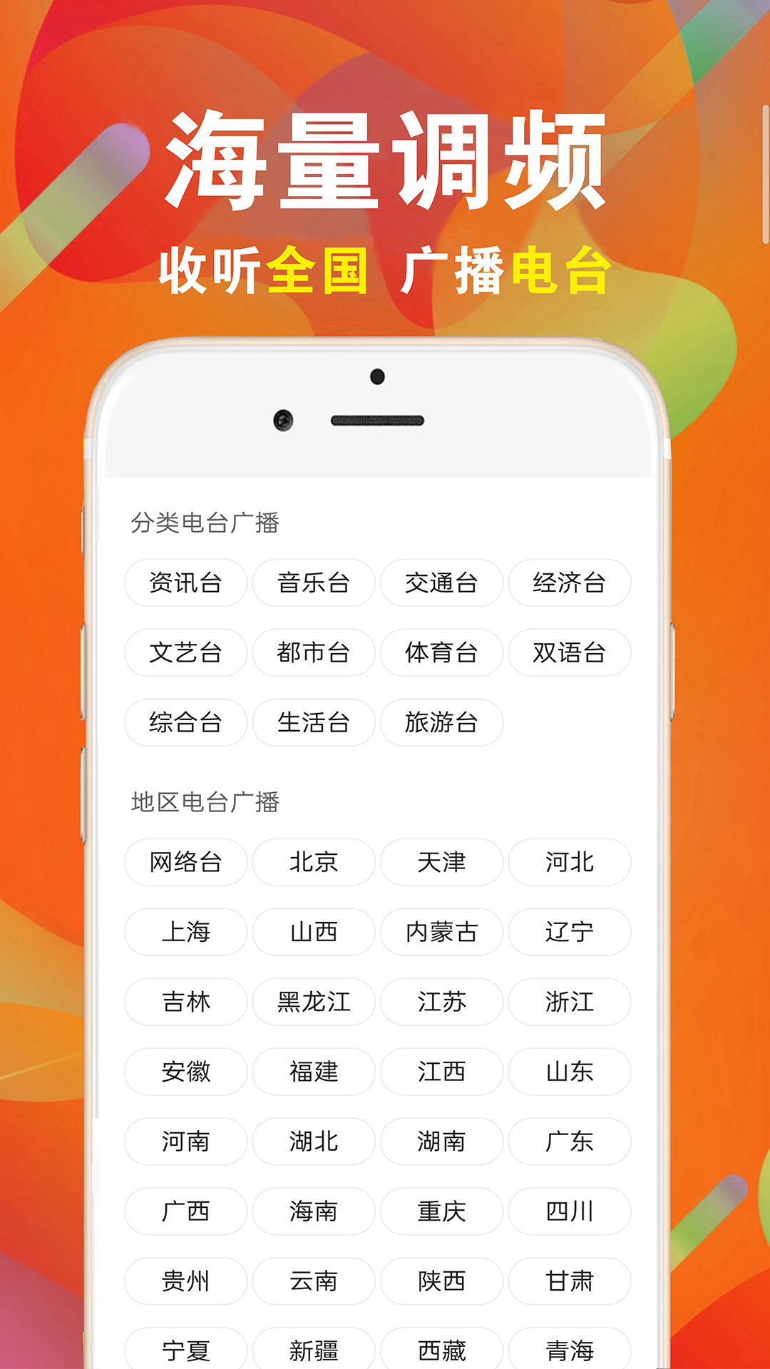 FM手机调频收音机是一款流畅,清晰的调频收音机。<br>频道多内容丰富清晰无需耳机的收音机<br>电台收音机收录有上千个国内FM广播电台,拥有专线7*24小时不间断直播。<br> 软件特点:<br>电台收音机每日动态更新新闻热点,随时随地听新闻。<br>电台收音机支持听小说、听相声、听音乐、听戏曲、听故事、听历史、听英语等等资源丰富。<br>电台收音机使用了先进的解码引擎,及时网络状况很差也能收听到高质量的电台广播。<br>电台收音机拥有专线服务器,适应各种网络播放要求。<br>电台收音机拥有全面的FM电台广播节目,全国各地频道应有尽有。<br>电台收音机涵盖 音乐、新闻、经济、交通、都市、体育、外语 等分类满足每个人的需求。<br>电台收音机操作简单,打开即可上手使用,不需要任何设置操作,点击即可播放。<br>您还可以一键收藏您喜欢的电台,方便实用。<br>电台 调频收音机 听新闻