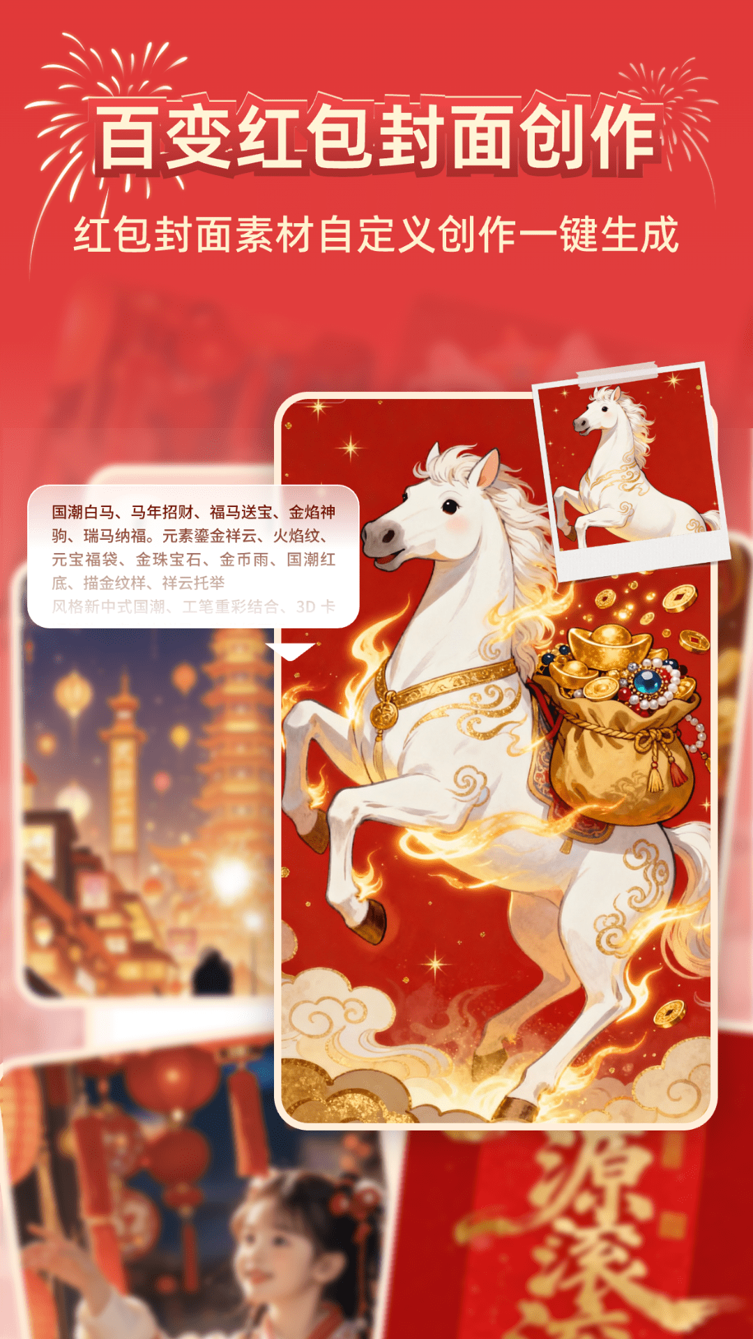 神秘马年盲盒封面:每日轻点开启神秘盲盒,仿佛探秘宝藏,专属马年元素的惊喜封面随时跃入眼帘,每一次开启都是与幸运的邂逅,让领取红包封面成为趣味盎然的新春仪式。<br><br>红包封面一键生成:百变红包封面自定义创作一键生成,任意红包样式,只需要描述画面内容就能轻松生成。<br><br>玩转新春:新年春联AI轻松生成,还可以你出上联,AI对下联,趣味多多,一键体验。祝福语生成、新春壁纸也能一键享用。<br><br>多元风格封面盛宴:活力四射的卡通形象封面,传统与现代交织的艺术封面,更有酷炫动感的动态特效封面,模拟烟花盛放、雪花纷飞,为新春添上梦幻一笔。还有搞怪逗趣的表情包封面,配上网络热梗文字,欢乐即刻送达。<br><br>海量封面随心选:简约时尚风,复古怀旧风,梦幻浪漫风,新颖吸睛样式目不暇接,无论你品味如何独特,这里总有一款能精准击中你的喜好。<br><br>持续焕新不停歇:我们的团队精心打磨每一款封面,紧跟马年潮流与节日氛围,不定期上新,确保你的红包封面库时刻储备新鲜血液,永不落伍。<br><br>《好运红包封面领取大全》重磅升级,特别推出马年专属版本,想要在马年让微信红包成为亲朋好友间的热议焦点?别再迟疑,即刻下载体验,踏上这场马年红包封面的奇幻之旅,送出满含新意与祝福的红包吧!