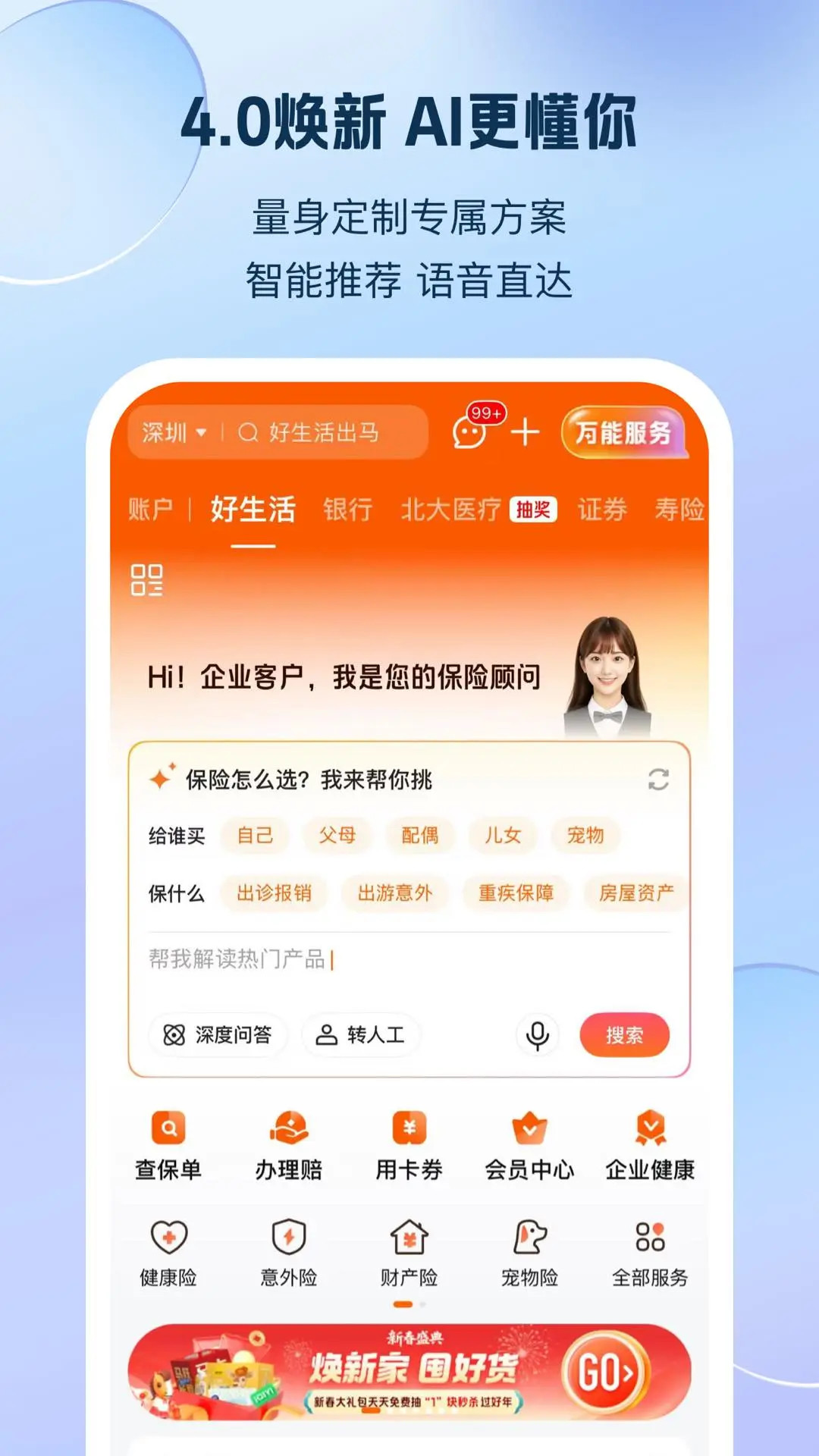 平安保险好生活•24小时保险生活服务管家 平安保险好生活APP是平安产险最新打造的以保险+服务为核心的生活服务平台。致力于提供一站式保险查询、购买、理赔、续保等功能,同时提供旅游出行、居家生活、医疗健康、省钱购物等数十项生活相关服务和最新资讯内容。用户不仅可在平台上享受优质保险产品的折扣优惠、拼团砍价等活动,还能体验父母体检、快速问诊、家政服务、生活缴费、银行卡服务、车辆相关等生活类服务 ——主要功能—— 【保险购买】可以在首页、产品菜单栏中选购精选保险,并且在注册时可获赠保险折扣券。 【在线理赔】在APP内购买的保险可以享受便捷的在线理赔服务,需按要求上传理赔所需材料进行审核。 【保单服务】“我的保单”中可查询到你在平安产险最近3年内的保单,并提供修改保单,补开通自动续保等功能。 【新人有礼】用户可在首次下载注册平安保险好生活APP后在“首页”频道免费领取新人大礼包一份,包含丝苗米、洗衣液等伴手礼 【分享有礼】用户在分享平安保险好生活APP或保险产品给到他人时,对方成功下载注册后用户可获得高额积分 【父母体检】用户可在首次下载注册平安保险好生活APP后在“活动中心”免费领取父母体检体验券一份,兑换父母体检服务一次。 【打卡签到】每天的签到可以阶梯式累积平台积分,积分可在【积分商城】内兑换商品和服务。 【积分商城】用户还可通过购买、分享产品、邀请好友、参与活动获取海量积分,积分可通过商城进行实物和服务卡券兑换。 【精选好物】用户可直接购买或通过积分兑换各种精选好物,为您提供便利、实惠的购物体验。 【保险课堂】用户在保险课堂频道可以浏览最新的保险行业资讯及相关法律法规,政策动态等。 【发现】发现更多生活美景!你可以在发现频道找到各种生活相关的热门有趣的生活方式和娱乐资讯。 【线上就医】用户可以在首页、发现菜单中享受免费问医生服务,包括导诊接待、选择医生、医生诊断、康复管理。 【生活服务】用户可在发现页享受便捷的健康、旅游、居家、生活、出行等一站式服务。 -----联系我们----- 微信公众号:pabxsc - 客服热线:95511