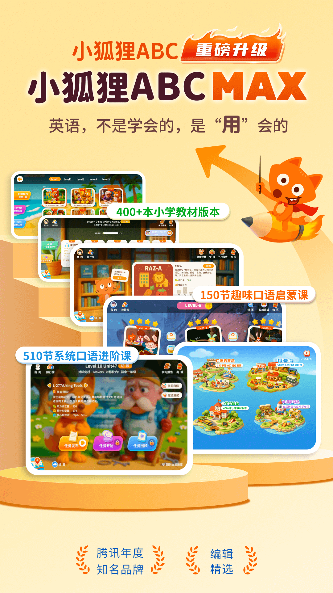 01 全球1000万+家庭信赖 150集沉浸式英语故事,东方版【哈利波特】,大量冒险、魔法等题材,孩子化身主角参与剧情互动,让孩子趣味学习; 02 好莱坞演员原声配音,超5100分钟原版对话 与剑桥大学教育研究生院专家合作开发,Hollywood好莱坞配音演员原声录制,超5100分钟的对话,输入纯正美音,对【中式英语】说拜拜; 03 真实生活场景,超2500+单词卡片 丰富的生活化场景:饭店、书店、农场、超市等,超2500+日常对话词、句,让孩子掌握大量单词的同时可以充分开口表达,从而培养纯正流畅的语言能力; 04 丰富配套工具,秒变学习神器 1000+好玩的卡片闯关游戏,激发兴趣,增强记忆;50首动感儿歌,1000+分钟小狐狸FM熏听,2500+拓展训练,海量配套学习工具,秒变学习神器。