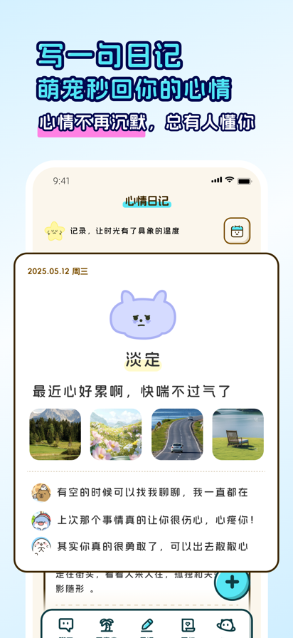 你是否也常常感到孤独? 来这里,遇见一只同样孤独的小鸟,和它成为最知心的朋友,开启一段温暖治愈的旅程。你们一起探讨生活的常态、一起创作不完美的作品、一起种花、一起冥想……在互动中,找到属于彼此的那份安心。 你一定会爱上这里: 【暖心互动】 小鸟每天都会和你分享它的奇思妙想,或许无厘头,却真诚可爱。给它摘果子、摸摸肚子,在小小的互动中,学会接纳生活的常态。 【自由创作】 - 画画:随机主题激发灵感,无需技巧,让色彩和线条自由流淌。 - 填诗:半首诗等你完成,没有“标准答案”,你的感受就是最美的诗句。 - 音乐:轻触水面,涟漪化作旋律,种下音乐种子,静待花开。 【沉浸疗愈】 - 陪伴放松:让温柔声音与自然音景将你包裹,卸下疲惫,在静谧时空里安放身心。 - 心情日记:捕捉每一刻情绪的微光,无需长篇大论,你的感受都值得被温柔收纳。 - 每日充能:默念一句温暖的自我肯定,做一个微小的行动,成为自己的能量站。 - 答案之书:向内心发问,收获只言片语的启示,你的问题自会指引答案浮现。 不完美,却足够美好: 这里的每一笔涂鸦、每一句诗、每一个音符,都是情绪的出口。基于表达性艺术疗愈理念,通过创作激活大脑奖赏回路,让你在放松中找回内心的平衡。
