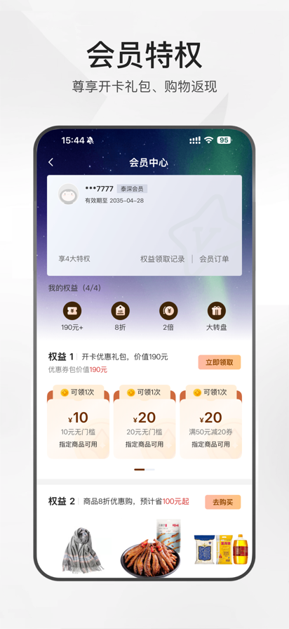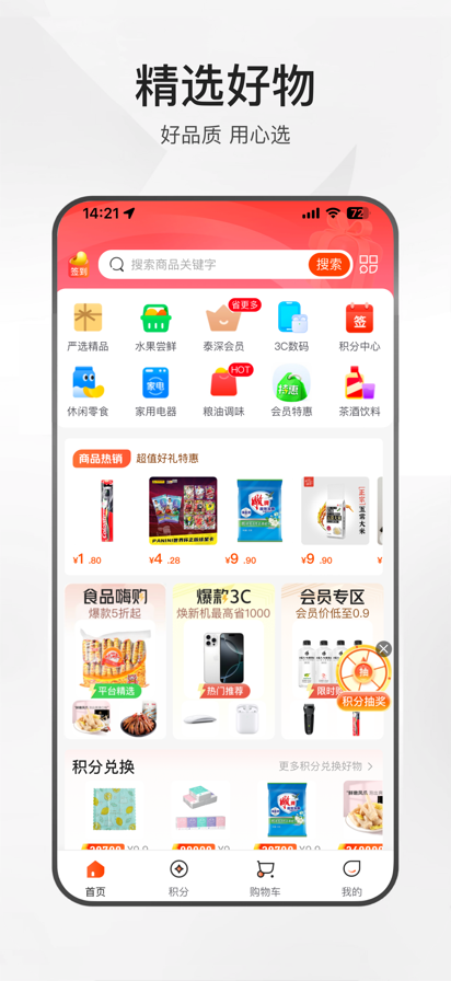 【精选好货,直击底价】全场商品超大折扣,限时特卖,休闲零食、美妆护肤、日常用品、家用电器众多品类,满足您的一站式购物需求! 【会员专享,专属特权】超值百元优惠券包,会员专享优惠购,全场商品购买双倍积分返现,还有惊喜转盘等您抽奖! 【积分商城,惊喜不断】消费返积分,每日签到送积分,积分当钱花,可兑换精美商品和可提现,玩转潮流新消费。 【品质保障,售后无忧】严格把控商品质量,平台提供全方位的保障,质量问题快速处理,提供客服7×12小时在线服务,以最快的速度为您解决,让您购物无忧。