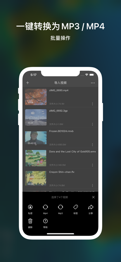一键将视频转换为mp4或mp3,可以运行在iOS9.3以上,没有广告,没有内购,不订阅。 - 转码 • 支持webm、movpkg、m3u、m3u8、 rmvb、avi、mkv、mp4、 flv、wmv、3gp、mov、vob、dvd、swf、rm、 ts • 支持视频一键转码为mp4或mp3格式,有利于导出到相册及上传到其他网站 • iOS11 支持 《文件》APP来管理视频文件,可以从其他APP中拷贝 - 导入视频 • 通过链接, Wi-Fi,AirDrop(iOS11+), iTunes,相册导入视频 - Wi-Fi 分享 • 在其他设备中使用WiFi传送存取及播放视频. • 自动为wifi地址生成二维码,其他设备可以通过扫码二维码快速分享 • 端口号可以为8080/8900/9100 - 私密视频 • 支持手势密码 • 支持生物识别(指纹或人脸) 解锁 • 相册视频、导入的视频及下载的视频都可以设为私密 - 分享视频或音乐 • 转码为mp4后可以使用系统分享,可以无缝分享到QQ、微信、微博、知乎、西瓜视频、抖音短视频等自媒体平台,也可以直接分享到剪影进行剪辑 - 画中画 • 3gp, mov, mp4 - 后台播放