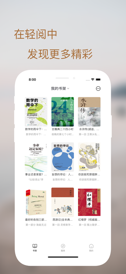 【简单易用】 一个简单、有点好用的电子阅读器。 【多格式支持】 支持txt、epub、mobi、azw、azw3、pdf、rar和zip等格式。 【在线阅读】 更强大的在线阅读模式,让阅读更加便捷有趣。支持将阅读模式的书籍导出为TXT格式。 【语音听书】 不但支持系统自带语音听书,还集成了Azure TTS语音和自定义语音,上百款激情而饱满的声音,任君选择。 【文本过滤】 文本过滤,支持文本过滤和正则表达式过滤,过滤烦人的文本广告。 【兼容性强】 和番茄小说、微信读书一样,轻阅也支持多目录的格式,不停地优化各个细节,给用户带来更好的阅读体验。 【更多功能】 提供了多种主题、自定义字体、简繁体切换和不同的翻页方式,暗黑模式和数据备份恢复等功能。