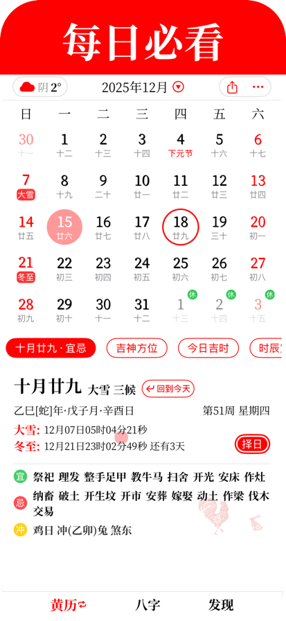 黄历万年历-天气日历农历查询工具,大家都选择的日历App! 提供万年历查询、日历查询、公历农历转换、精彩资讯、日程记事、节日节气、生日提醒等实用功能。 特色功能,等您来体验 【黄历】传统黄历功能随身携带 【日历】节气节假日随时查看 【天气】天气实时预报,出门必备 更多精彩内容,期待您的探索... 黄 历 万 年 历 - 天 气 日 历 农 历 查 询 工 具 等 你 来 下载 ! 【黄历万年历连续包月/包年自动续费服务规则】 本规则视为《用户协议》不可分割的组成部分,当您点击订阅、开通及使用自动续费服务时,视为同意并接受本规则。 您理解并同意: 1.黄历万年历的会员月卡/季卡订阅服务(以下简称“本服务”),是指为您提供连续订阅月会员服务和连续订阅季会员服务。如您开通了本服务,则视为您授权老黄历日历在管理自动续期页面显示的扣款日期,从您的自有账户中代扣下一个计费周期的费用。若因上述账户可扣款余额不足导致续费失败,由您自行承担。若您未主动取消本服务,我们可能在您账户余额恢复充足时,继续为您提供自动续费服务。您有权自主取消本服务; 2.订阅周期:1个月会员连续订阅服务,价格9元/月。1个季度季会员连续订阅服务,价格25元/季; 3.购买自动续费服务后,会在每个计费周期到期前1天,自动在iTunes账户扣费并延长该计费周期对应的连续订阅服务; 4.如需取消自动续费功能,请打开您的苹果手机“设置”-进入“iTunes Store与App Store”-点击”Apple ID”-选择“查看Apple ID”-进入“账户设置”页面-点击“订阅”-找到“黄历万年历”-点击“取消订阅”。如未在计费周期到期1天前取消自动续费功能,将会自动续订及扣款。 使用者协议:https://m.yiqibazi.com/agreement/lhl/Policy.html 连续订阅协议:https://m.yiqibazi.com/agreement/lhl/Policy.html?rules#rules 隐私条款:http://m.yiqibazi.com/agreement/lhl/Privacy.html