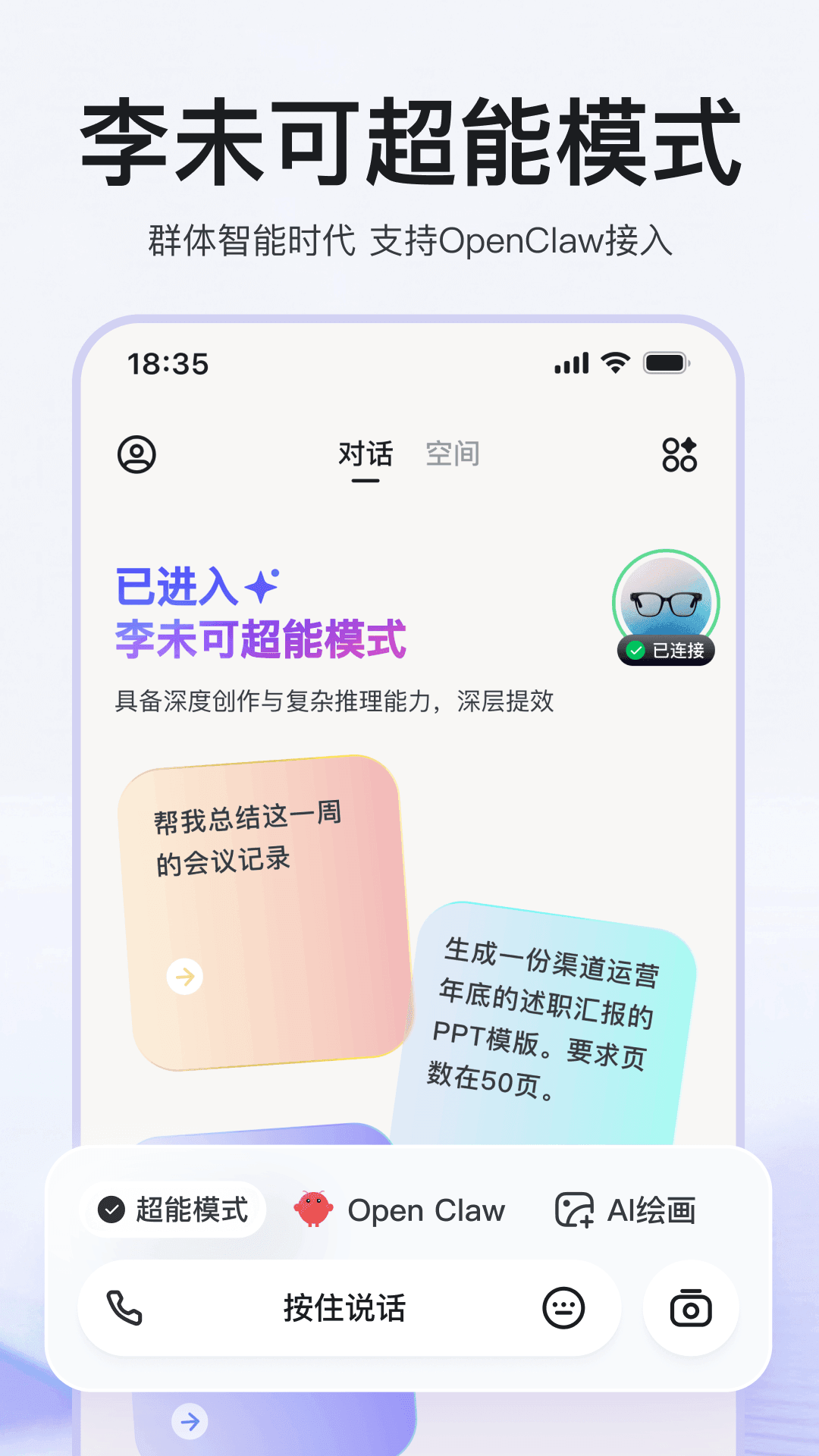 李未可GO App是连接李未可眼镜设备的核心应用,深度集成自研WAKE-AI大模型,作为任务式交流系统,支持AI聊天、AI搜索与多模态识别(View型号专属),并接入DeepSeek R1满血版、千问3、豆包SeedR1等大模型。首创ZeroAgent框架,只需说出需求,即可自动匹配最合适的AI智能体来完成任务,全面满足商务、旅行、生活等多元场景的AI需求。<br><br>原生核心功能包括:<br>AI随时译:支持128种语言翻译,重点优化日语、越南语、印尼语、阿拉伯语等小语种,支持多场景翻译和拍照翻译(View型号专属)。<br>AI随身记:一键录音,自动生成会议纪要、灵感笔记,支持PC端同步编辑,高效管理信息。<br>AI随地游:基于位置智能推荐周边吃喝玩乐,View型号支持AI讲解地标、菜单识别、拍照播报一体化,旅行更轻松。<br>AI即刻拍(View型号专属):语音控制拍照,第一视角记录生活,自动同步相册,彻底解放双手。<br>多端同步:安装Chrome浏览器【李未可助手】插件,实现PC端AI对话与随身记同步,体验更多智能体和AIGC服务。<br><br>下载李未可Go App,开启多元AI新生活!