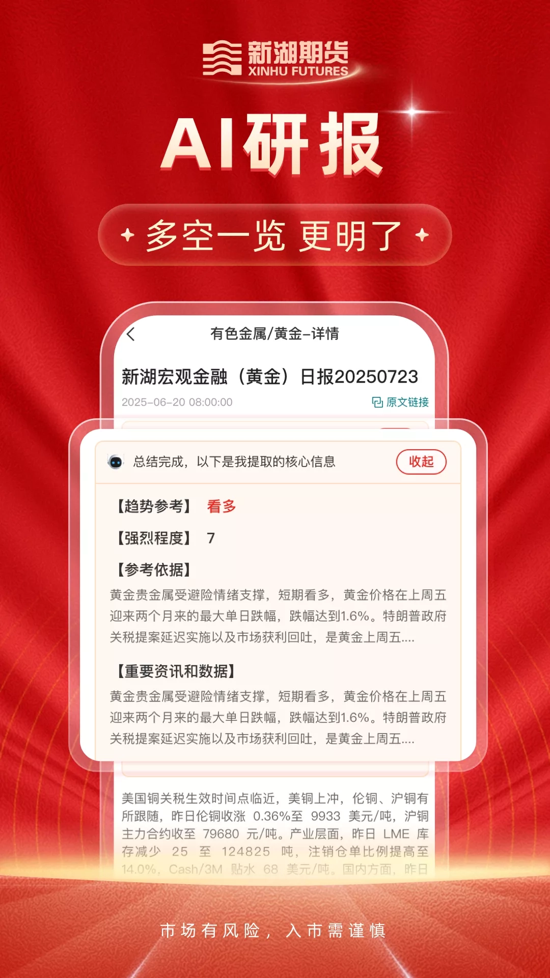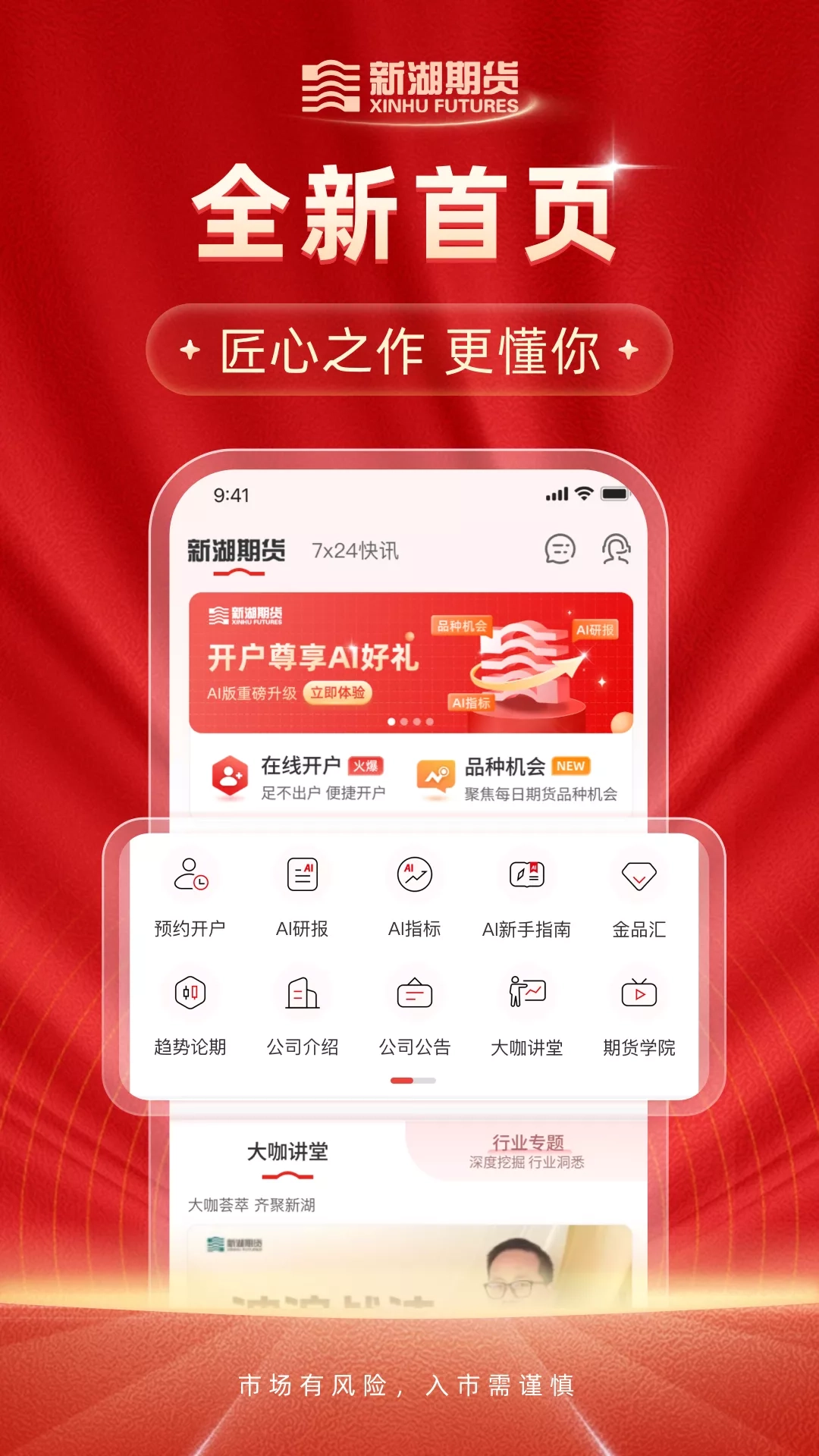 新湖期货股份有限公司为投资者提供期货交易、期货行情、手机开户、业务办理、热点资讯等综合金融服务。致力让每一位投资者都能享受安全、便捷、快速的期货投资服务,持续为社会、客户、员工创造高价值的衍生品金融服务公司。 【产品功能】 ①全新AI功能:AI研报秒级解读、AI十大指标深度解析,精选品种机会每日推荐。 ②期货开户:手机期货开户、银期对接无需临柜,线上远程完成,方便快捷。 ③预约开户:7x24小时预约开户,随时随地可以进行预约开户,客户一对一服务。 ④期货行情:实时行情数据,多种分析周期,多技术指标,追踪内外盘行情。 ⑤期货交易:便捷下单,交易快人一步,高效便捷的银期转账服务。 【公司背景】 新湖期货股份有限公司(以下简称“新湖期货”)成立于1995年,净资产近13亿元,公司主要股东为杭州兴和投资发展有限公司、上海众孚实业有限公司。拥有500多名员工,在全国设有29家分支机构和2家子公司,在行业内的影响力日益扩大。新湖期货为中国期货业协会理事单位、上海市期货同业公会会长单位、大连商品交易所理事单位、郑州商品交易所理事单位等。 【服务体系】 新湖期货一直坚持走产业化和专业化服务之路,秉承“创新服务价值共享 ”的理念,突破传统思维方式,强化创新服务意识,形成以研究所为中心,以营业部事业部制为支点,以专业营销为平台,以先进技术为支持,以合规管理为文化的专业化期货中介业务服务体系。 【联系我们】 公司官网:www.xinhu.cn 人工客服:400-888-8398 “投资有风险,入市需谨慎”