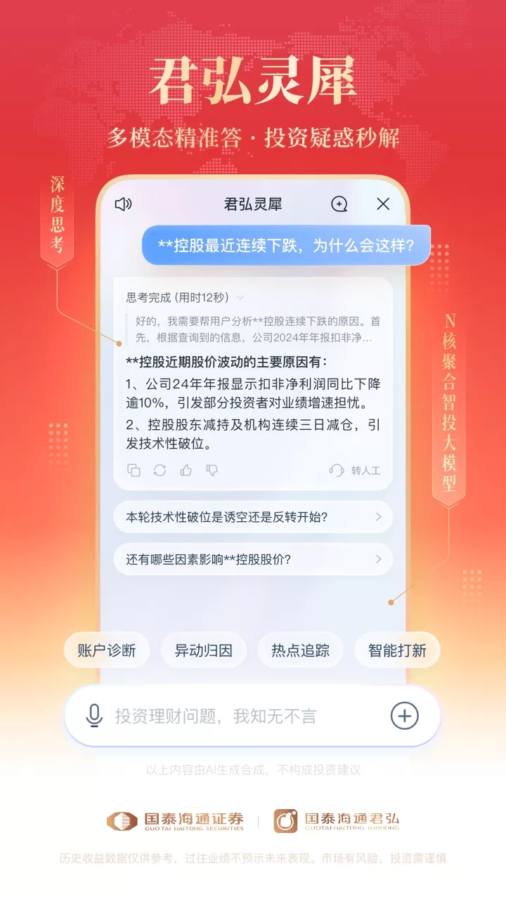 国泰海通君弘App是国泰海通证券倾力打造的一站式综合理财平台。由国泰海通证券自主研发,集闪速全球行情、场景化交易及账户、前沿人工智能、集萃理财商城和精选投资资讯等模块于一体。截至2025年6月,拥有用户超过6000万,获得权威大小奖项共100余项。 特色功能介绍: 【闪速全球行情】 1.行情速度稳居行业前列,刷新速度毫秒级响应; 2.Level-2 Plus还原真实委托单,深市更提供千档行情; 【场景交易/账户】 1.简单几步即完成交易,分时图也支持闪电下单; 2.智能打新可提前预约一周新股申购,360全景账户打造专属投资对账单; 【前沿人工智能】 1.异动雷达智能盯盘,实时推送个股瞬息变化,解放盯盘双眼; 2.多空旗手联合筹码分布,经典策略挖掘个股,大数据解析个股表现; 【集萃理财商城】 1.新手理财、千款基金,总有一款产品适合您; 2.现金管家满足您闲置保证金在夜晚理财的需求; 【精选投资资讯】 1.专业研究报告精准推送,本土超强研究团队为您量身打造投资良策; 2.君弘在线,满满干货满足视听味蕾,告别书面资讯; 【新客享好礼】 新客户通过国泰海通君弘APP开立证券账户,可获得level-2行情月卡、形态大师三个月、新客理财券一张、盘中宝三个月、新手投教课。开户成功后,卡券将自动发放到对应的君弘APP上,限有效期内使用一次,活动长期有效。 更多详情,欢迎垂询国泰海通证券官方服务热线:95521。 【投资有风险,入市需谨慎】
