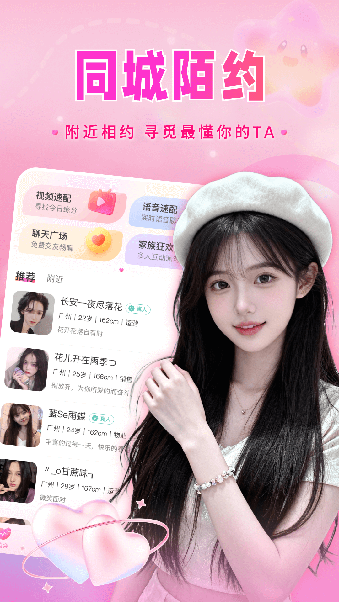 想聊天,想交友,想约会,想脱单吗?<br>同城单身男女在线汇集地,1分钟约见附近单身的TA!<br>也许你曾经对爱情迷茫失望过,但这都不重要了,因为你遇到了它!<br>它能让你摆脱深夜的孤独,让你不错过身边的每段缘分,让你寻觅到一份属于自己的真挚爱情!<br><br>同城陌约,是一款同城附近单身男女聊天约会社交软件,在这里,您可以倾诉心声、分享快乐,也可以发现TA的闪光点,默默拉近彼此的距离,相中命中注定的那个TA。<br><br>【推荐列表】:优先推荐附近异性,拉近彼此的距离感<br>【动态心情】: 告别尬聊,动态记录生活的点点滴滴<br>【甜蜜互动】: 精彩瞬间,私信分享彼此的所见所感<br>【多重认证】:实名认证,真人认证,视频认证,展现真实的彼此<br>【同城交友】: 更多机会,尽在在同城陌约!