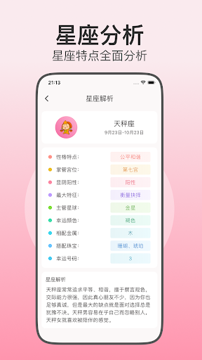 灵占星座APP是一款结合传统文化和星座文化的新型应用。在应用中您将体验到传统文化与星座文化融合之美,从而了解自我,领悟人生真谛。晓通星运,逆转未来。<br>灵占星座APP由以下重要功能构成:<br>★星座动态:包含了今日动态、明日动态、本周动态、下周动态、本月动态,每一天的动态,都会详细描述爱情、财富、健康、工作、学业走向,还提供了每日开运饮品、每日开运食材,还有各类提点,助你每日都过得开开心心,充实又幸福!<br>★测测问问:遇事不决就用问一问!问问的星座骰子,在你遇到生活琐事问题时不妨大胆问一问,总能给到你启发性的回答。还有独家爱情牌,在你遇到爱情难题时可以为你解释一切!超好用!还有简单直接的抛硬币解答,快速简单又实用!<br>★星盘剖析:星盘剖析中提供了大量不同的星盘,包括了星座合盘、天象盘、本命盘、行运盘、三限盘、次限盘、月返盘、日返盘、日弧盘、法达盘。并基于这些盘,详细分析你的星盘走向,桃花恋爱情况,财富发展潜力和婚姻家庭事业,帮你知晓星运,逆转未来,走向成功幸福的人生!<br>★十二星座:详细分析白羊座、金牛座、双子座、巨蟹座、狮子座、处女座、天秤座、天蝎座、射手座、摩羯座、水瓶座、双鱼座他们的性格优点缺点,不同血型下的个性特征。还包含星座合盘,详细分析不同星座之间彼此的缘份。<br>★爱心农场:想增加自己的好运?快来爱心农场领养小动物,你可以养幸运锦鲤,养小猪和小猫,通过每日饲养他们,获得爱心用来捐赠,给自己积无量善德,做好事,必有好报。<br>灵占星座还有更多的功能,期待你的发现和探索,希望她能助你走向成功的道路,开启幸福的人生!