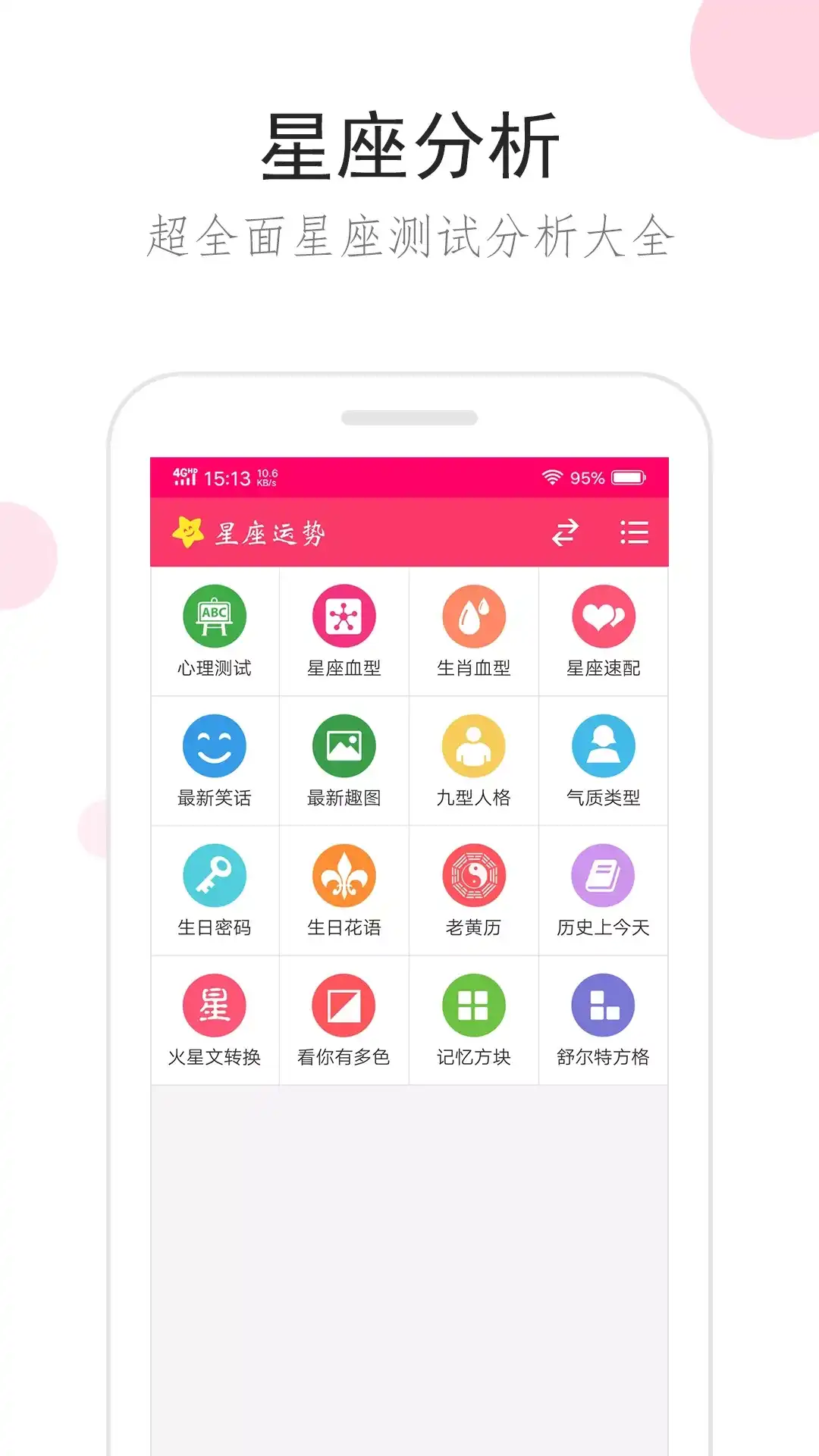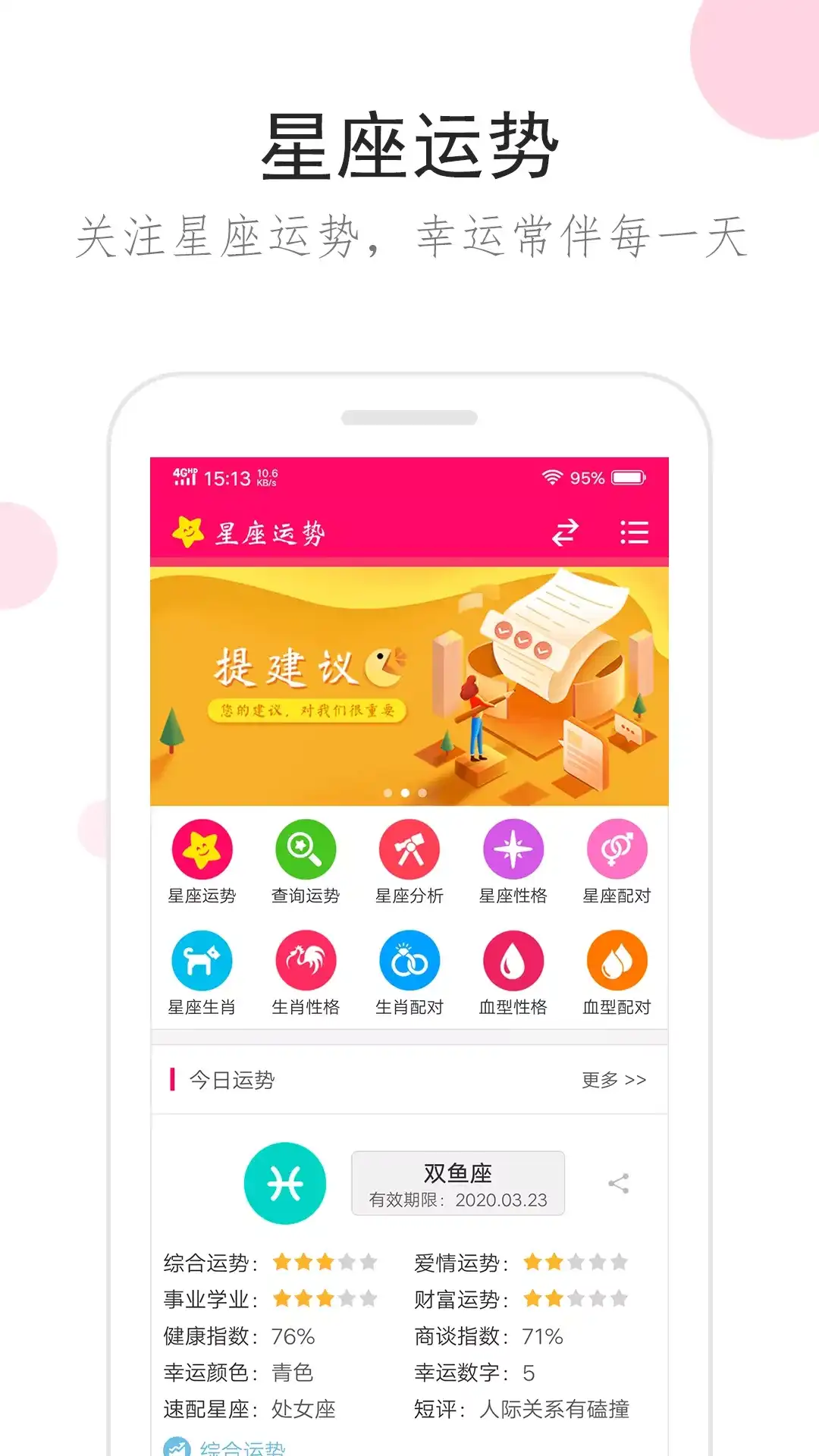 新鲜有趣的星座运势大全和性格测试工具,解析你的每日星座运势,提供丰富的星座和心理测试,十二星座运势每天更新,可以帮助你了解每个星座的每日,每周,每月的运势变化,更好了解自己和他人的星座运势和星座性格。 【新鲜好玩的星座运势大全】 1 星座运势:全面解析你的每日星座运势,帮你了解12星座的每日,每周,每月的运势变化 2 星盘解析:通过星座认识你的星盘,解读星盘的奥秘 3 星座性格:详细分析12个星座的性格,恋爱,起源故事,快速成为星座达人 4 星座配对:测你和恋人之间的爱情指数,心理分析,配对解读 5 星座排行:12个星座的各种排行,让你了解更多星座知识 6 星盘情侣速配:通过星盘,看情侣之间的恋爱匹配 7 星座生肖血型:通过星座,生肖,血型三个角度解析你的性格特点 超人气12星座主题乐园,就在星座运势大全!