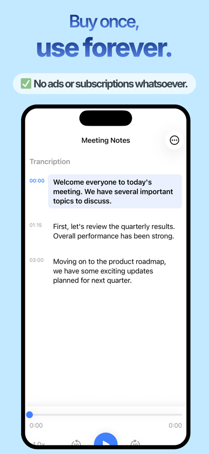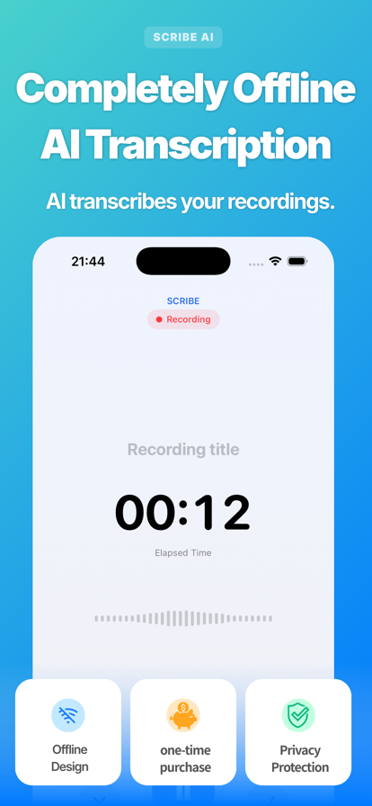 Your voice stays only within your device. Scribe AI is an AI transcription app that operates completely offline. No audio data is ever sent to the internet. ■ Complete Privacy Protection ・100% of audio processed within the device ・No cloud uploads whatsoever ・Confidential and personal information remains secure ■ Accurate Transcription Powered by Whisper AI, your recordings are transcribed with high accuracy. Review your transcriptions anytime, with every word captured precisely. ■ Key Features ・Completely offline operation - No internet connection required ・Automatic transcription - Audio converted to text after recording ・Employs high-accuracy AI technology ・Playback speed adjustment ・Segment tap - Tap text to play the corresponding audio ・Search function - Search recordings by title and content ■ Why a One-Time Purchase? Many transcription apps use a subscription model, costing over $10 per month. Over a year, this can amount to more than $120. Scribe AI is a one-time purchase. Buy it once, and it's yours forever. No ads. No additional charges. ■ Please Note ・An AI model (approx. 500MB) will be downloaded on first launch ・After download, it operates completely offline ・Requires iOS 15 or later Securely and reliably turn your voice into text. Scribe AI - Offline Transcription ■ Terms of Use https://www.apple.com/legal/internet-services/itunes/dev/stdeula/