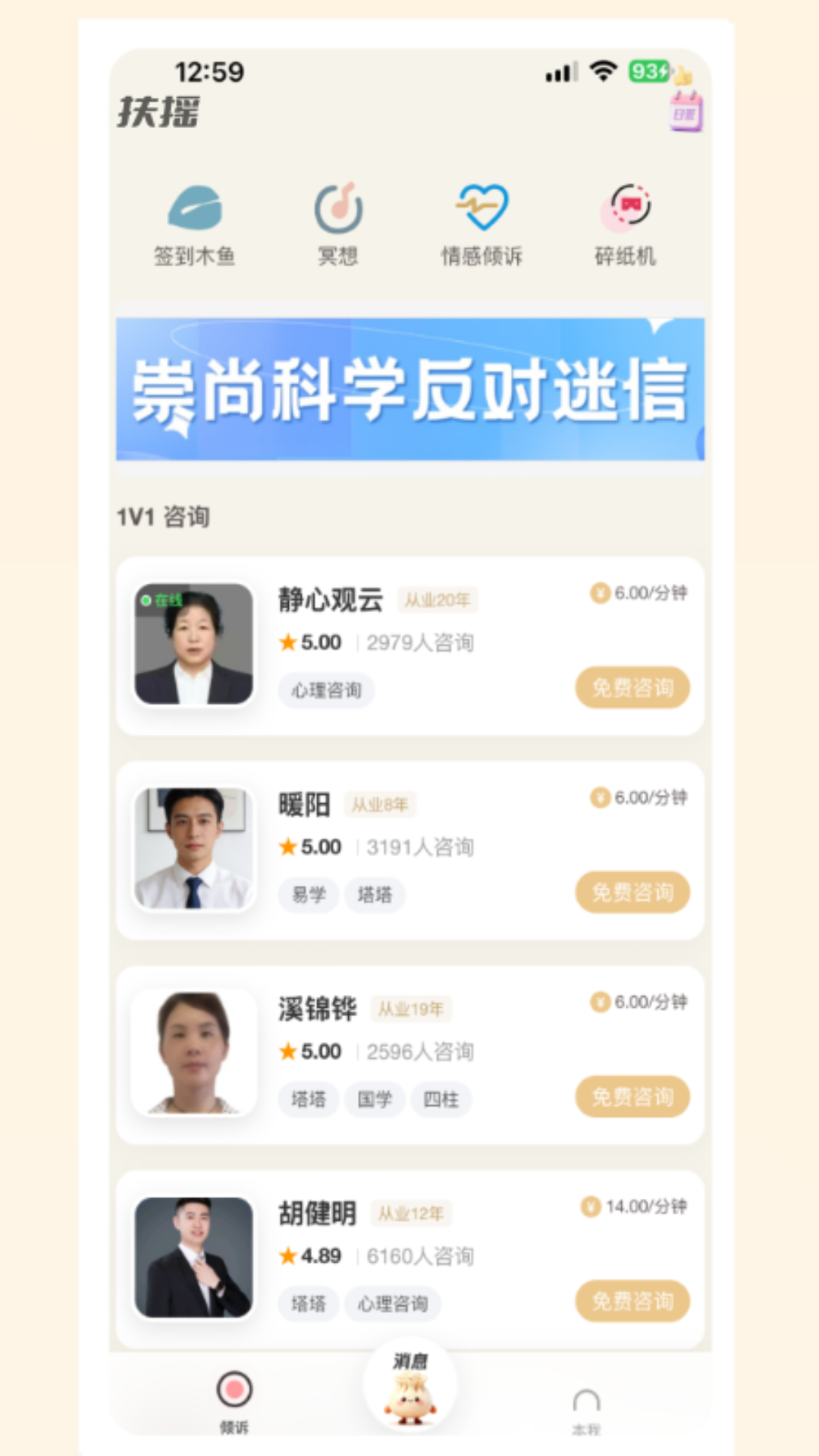 婚姻情感咨询类APP<br>一站式情感倾诉疗愈平台,承包你的全周期心理呵护。从婚姻咨询,专业疏导,到科学冥想、答疑解惑,满足不同需求。银行级加密保护隐私,安全无顾虑。无论深夜还是清晨,随时为你提供温暖陪伴,驱散阴霾,拥抱阳光。