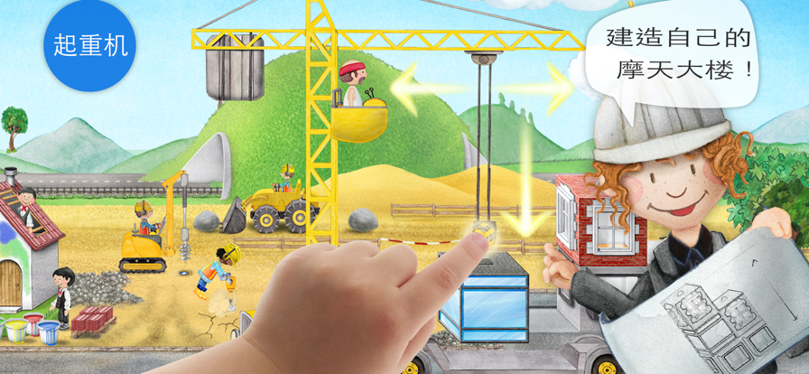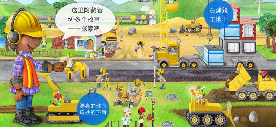 你是否痴迷建筑工地和建筑机械?来我们的建筑工地吧,你可以在这里自己操控起重机、挖掘机、推土机、装载机、隧道凿岩机和其他各种机械,动动手指就可以全盘掌控。最爽的是:你还可以自定义小建筑工的造型,让他更有个性。 ▸ 2-6岁小孩的绝佳选择。 ▸ 12种建筑机械,50多个交互故事等你发掘。 所有机械都由你操控: 主要特色:你可以玩所有机械,一切都由你操控。 • 使用起重机建造自己的摩天大楼 • 用挖掘机挖一个大坑 • 装卸大型自卸车 • 使用用三种机械修出自己的路:首先铺沥青,然后压平,最后涂料 • 从大山中开凿一条隧道 • 使用装载机运走路上的大石头 • 把房间刷成你喜欢的颜色(或五颜六色) • 用钻井机随处发掘水源 • 用手提钻打碎地面 • 用翻斗车把碎石从建筑工地运走 还有很多很多…… 样式包-让你的建筑工看起来更有个性: • 穿条纹的还是格子的?你可以随心所欲地装饰你的建筑工:头发、面部、头盔、衬衫、裤子、鞋子——一切都可以自定义。 • 喜欢绿色还是黄色?机械的颜色都可以轻松更换! • 金发还是棕发?卷发还是马尾?想怎样就怎样! • 机械和建筑工可选样式共达65,000多种。 建筑工地上还有什么? 与以往一样,我们总是会隐藏着一些小故事等你探索: 50多个老少皆宜的交互动画冒险故事,其乐无穷: • 帮助建筑师读懂建筑计划。 • 驾驶火车从自己开凿的隧道穿过 • 糟糕,泥瓦匠砌砖把门给堵住了……怎么办? • 小鸟吵闹得起重车司机无法安心工作…… • 让建筑工人们休息一下。 • 帮助屋顶工盖屋顶。 • 打开收音机,建筑工们就会跳舞,看他们跳得多搞笑! ▸ 还有更多冒险等着你……这么多值得探索,你还等什么? 一如既往的惊喜: ▸ 自己画市标!