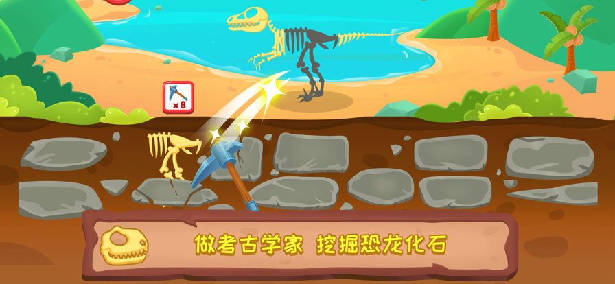穿过沙漠和草原,一起去挖掘埋藏在地底下的恐龙化石吧。在挖掘现场,充满了惊喜和挑战,发现传奇恐龙的骨骼,组装您喜爱的恐龙。现在加入恐龙冒险旅程吧。 ●回到现恐龙时代 你可选择不同时期进行挖掘,比如“三叠纪,侏罗纪,白垩纪”,寻迹草原、森林、沙漠等地貌,将自然科学和恐龙考古相结合。一共有两种不同类型的恐龙可供你选择,一种是肉食性恐龙,如“迅猛龙,始盗龙”,一种是食草性恐龙,如“板龙,三角龙”。 ●化身小小考古学家,模拟挖掘现场,辨认化石,判断恐龙身份并复原。 你可以在地图上选择你想要挖掘的恐龙化石进行挖掘,可以借助铲子,炸弹等工具来帮助你。将挖出来的恐龙化石放到实验室里进行拼合,拼好每一只恐龙的骨骼后,可以立刻还原真实的恐龙,苏醒后的恐龙将开展一段有趣的冒险,我们可以跟随恐龙们的脚步,来到它们生活的场景,喂养它们。在探索中可以了解到恐龙的习性以及它们生活的时代。 食肉者霸王龙、食草的梁龙、掠食者迅猛龙......28只恐龙的化石正深埋在地下,你可以见到各种各样的骨骼,通过这些恐龙化石,亲身感受恐龙的世界。 特点: • 挖掘,组装28只不同恐龙的骨骼 • 丰富的动画和声效让恐龙看起来更加生动 • 三叠纪,侏罗纪,白垩纪三个恐龙时期可以选择 • 描绘不同恐龙各自的外形特征、食性、生存年代和分布区域,建立起清晰的恐龙视觉印象。